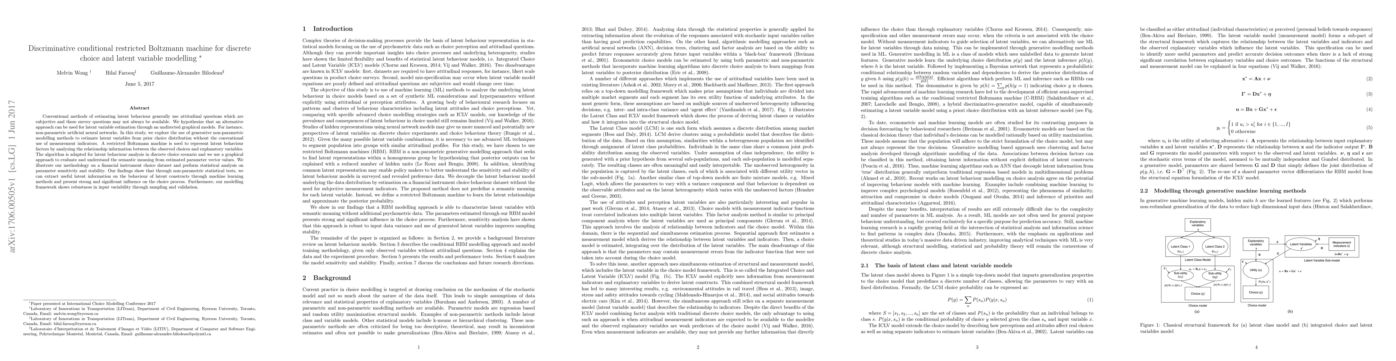 This paper proposes a discriminative conditional restricted Boltzmann machine for estimating latent variables from prior choice distributions without traditional measurement indicators. The method demonstrates robustness and significant influence on discrete choice processes, as shown through statistical analysis and application to a financial instrument choice dataset.