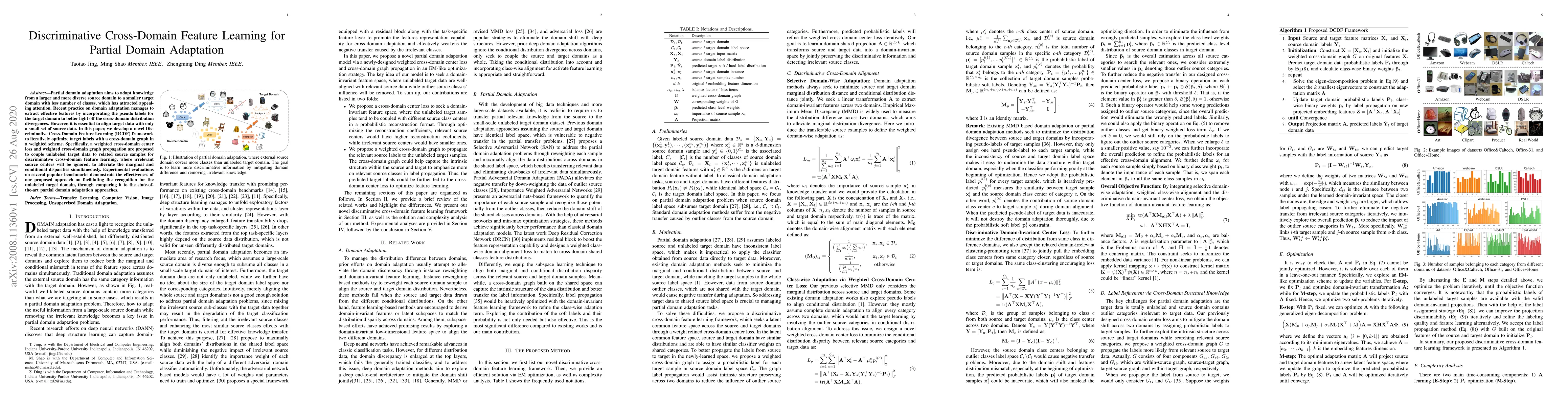 This paper proposes a novel Discriminative Cross-Domain Feature Learning (DCDF) framework to enhance partial domain adaptation by iteratively optimizing target labels using a weighted cross-domain graph. The approach effectively aligns unlabeled target data with relevant source samples, ignoring irrelevant sources, and demonstrates improved performance on benchmarks compared to state-of-the-art methods.