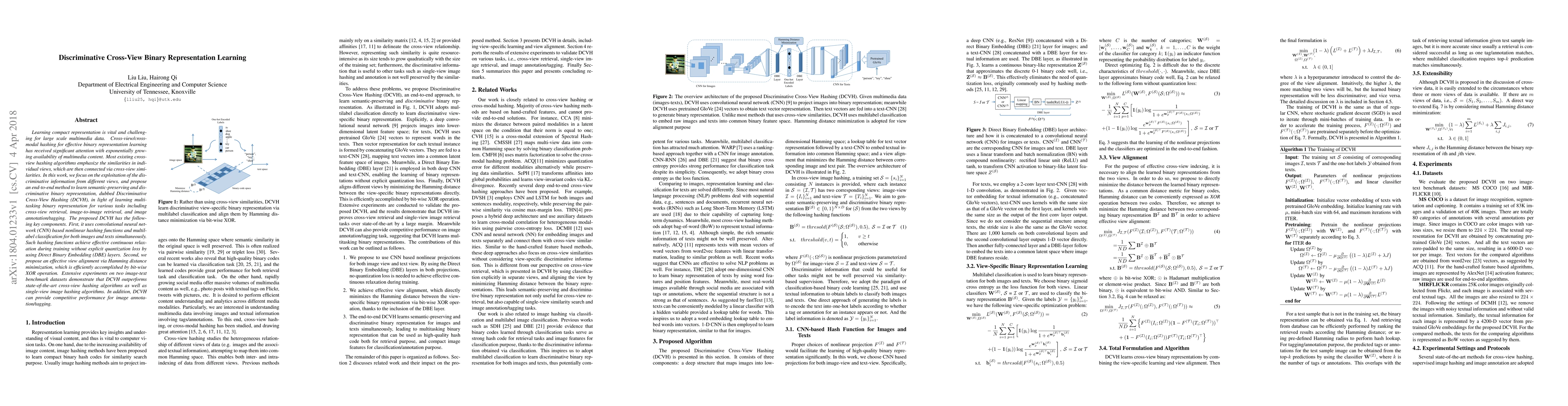 This paper proposes Discriminative Cross-View Hashing (DCVH) to learn compact, discriminative binary representations from multi-view multimedia data, using CNN-based nonlinear hashing and multilabel classification. DCVH outperforms existing methods in cross-view retrieval, image-to-image retrieval, and image annotation tasks.