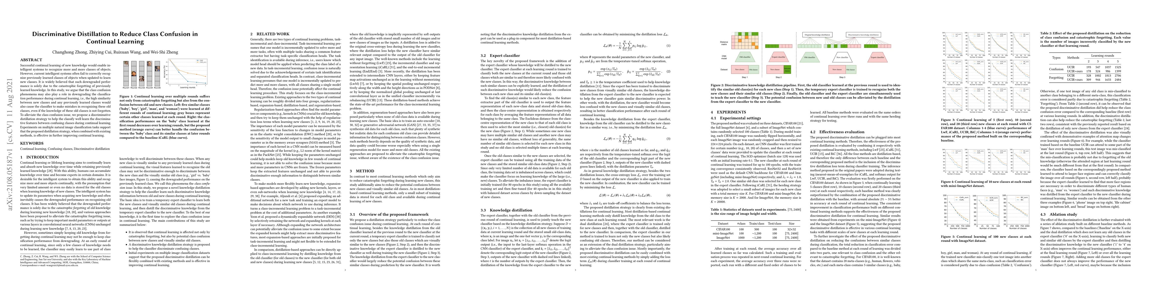 This paper proposes a discriminative distillation strategy to reduce class confusion in continual learning, arguing that high similarity between new and previously learned classes can cause recognition errors. The method aims to improve classification performance by learning discriminative features between confusing classes, and experiments show it enhances continual learning performance.