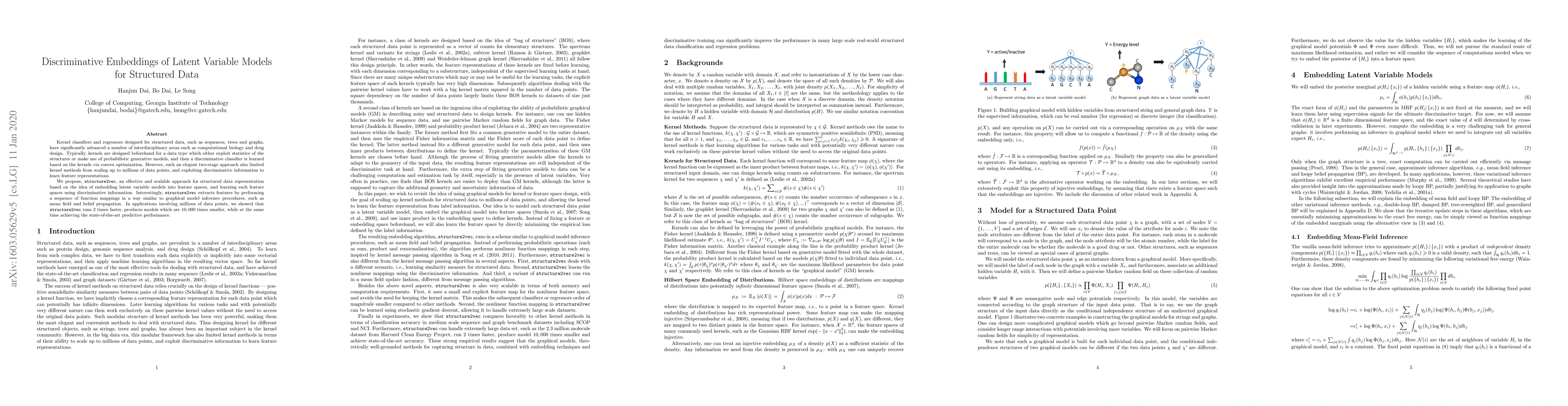Kernel classifiers and regressors designed for structured data, such as sequences, trees and graphs, have significantly advanced a number of interdisciplinary areas such as computational biology and drug design. Typically, kernels are designed beforehand for a data type which either exploit statistics of the structures or make use of probabilistic generative models, and then a discriminative classifier is learned based on the kernels via convex optimization. However, such an elegant two-stage approach also limited kernel methods from scaling up to millions of data points, and exploiting discriminative information to learn feature representations. We propose, structure2vec, an effective and scalable approach for structured data representation based on the idea of embedding latent variable models into feature spaces, and learning such feature spaces using discriminative information. Interestingly, structure2vec extracts features by performing a sequence of function mappings in a way similar to graphical model inference procedures, such as mean field and belief propagation. In applications involving millions of data points, we showed that structure2vec runs 2 times faster, produces models which are $10,000$ times smaller, while at the same time achieving the state-of-the-art predictive performance.
