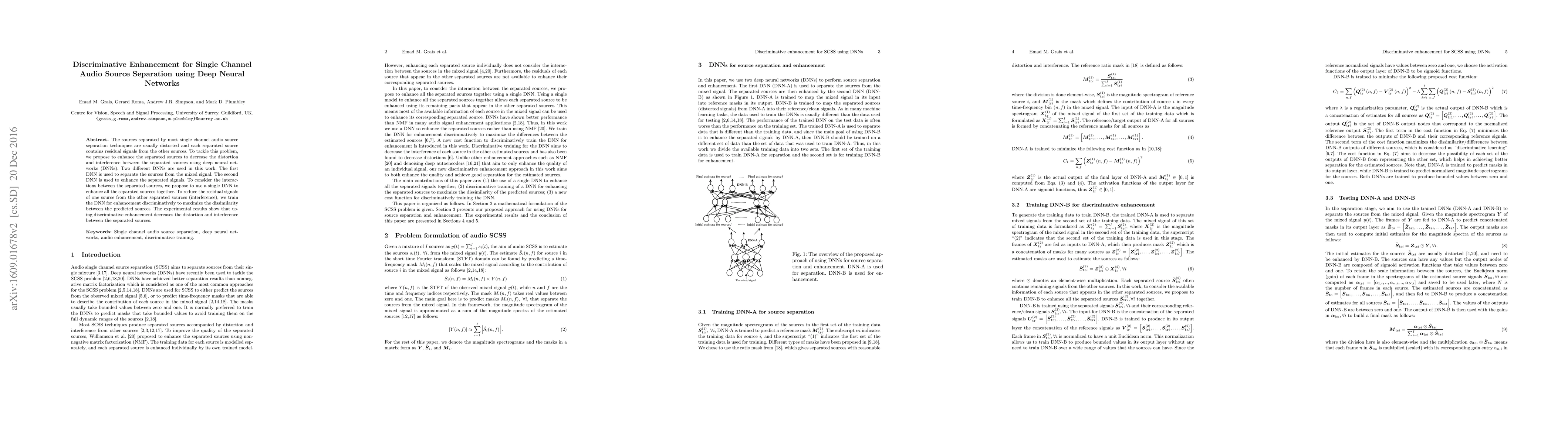 This paper proposes a method using deep neural networks (DNNs) to enhance single channel audio source separation, reducing distortion and interference between separated sources. It employs two DNNs: one for initial separation, and another for discriminative enhancement to maximize dissimilarity between the separated sources, achieving better separation performance.