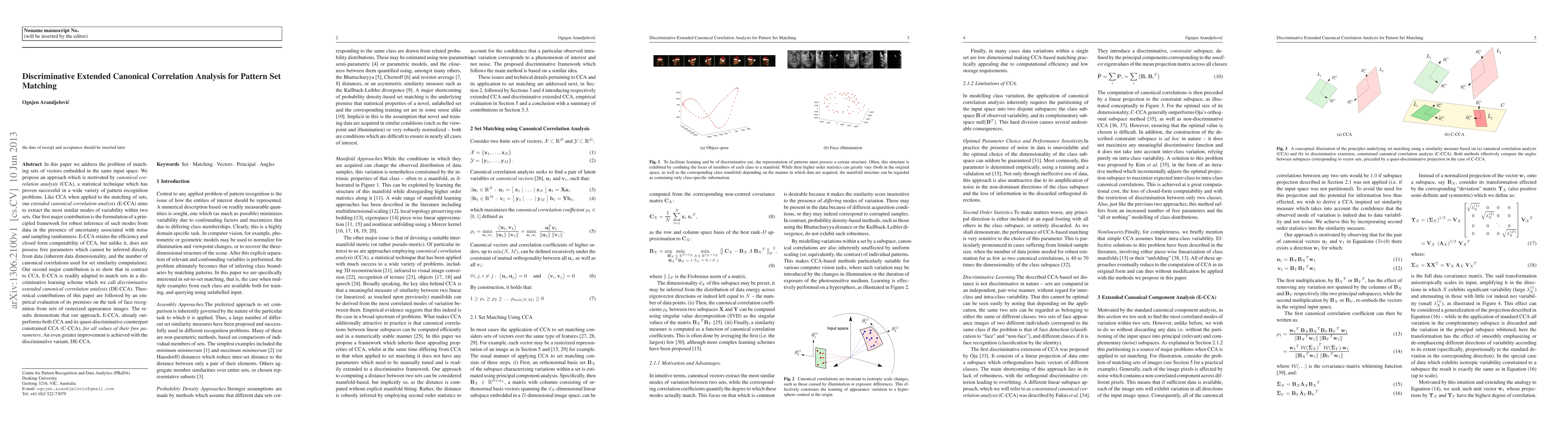 In this paper we address the problem of matching sets of vectors embedded in the same input space. We propose an approach which is motivated by canonical correlation analysis (CCA), a statistical technique which has proven successful in a wide variety of pattern recognition problems. Like CCA when applied to the matching of sets, our extended canonical correlation analysis (E-CCA) aims to extract the most similar modes of variability within two sets. Our first major contribution is the formulation of a principled framework for robust inference of such modes from data in the presence of uncertainty associated with noise and sampling randomness. E-CCA retains the efficiency and closed form computability of CCA, but unlike it, does not possess free parameters which cannot be inferred directly from data (inherent data dimensionality, and the number of canonical correlations used for set similarity computation). Our second major contribution is to show that in contrast to CCA, E-CCA is readily adapted to match sets in a discriminative learning scheme which we call discriminative extended canonical correlation analysis (DE-CCA). Theoretical contributions of this paper are followed by an empirical evaluation of its premises on the task of face recognition from sets of rasterized appearance images. The results demonstrate that our approach, E-CCA, already outperforms both CCA and its quasi-discriminative counterpart constrained CCA (C-CCA), for all values of their free parameters. An even greater improvement is achieved with the discriminative variant, DE-CCA.