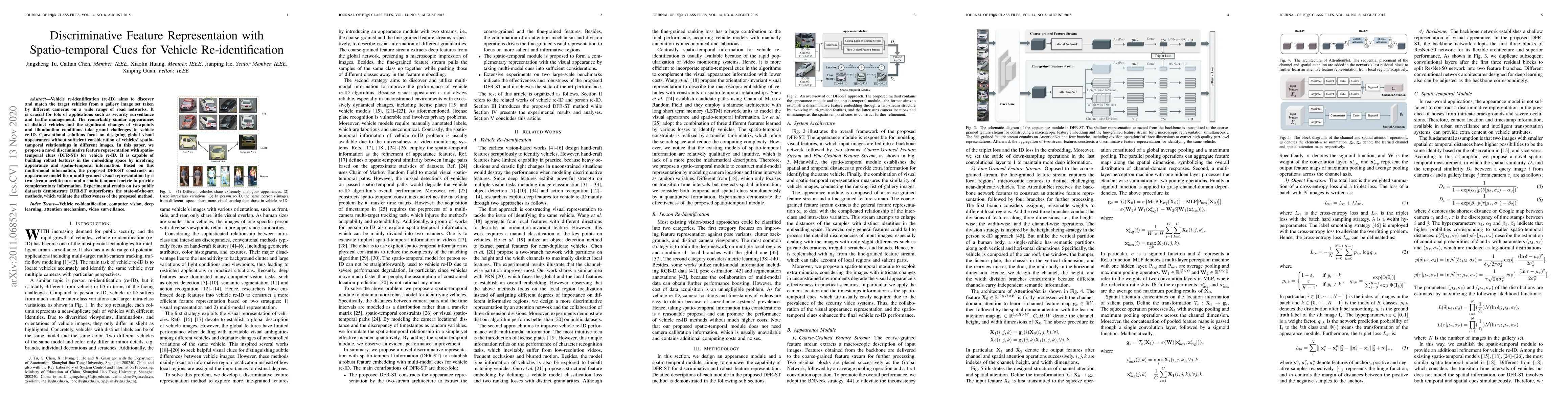 This paper proposes a novel discriminative feature representation with spatiotemporal cues (DFR-ST) for vehicle re-identification, incorporating both appearance and spatio-temporal information to build robust features. Experimental results show DFR-ST outperforms state-of-the-art methods on two public datasets.