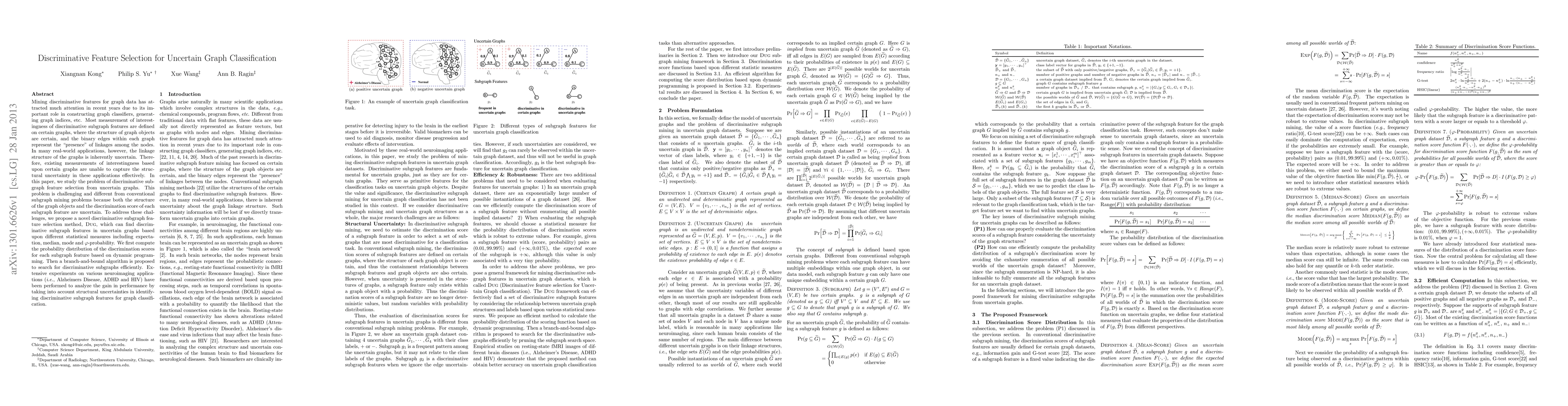 A new method called DUG is proposed to select discriminative subgraph features from uncertain graphs, improving performance in neuroimaging applications like Alzheimer's Disease, ADHD, and HIV.