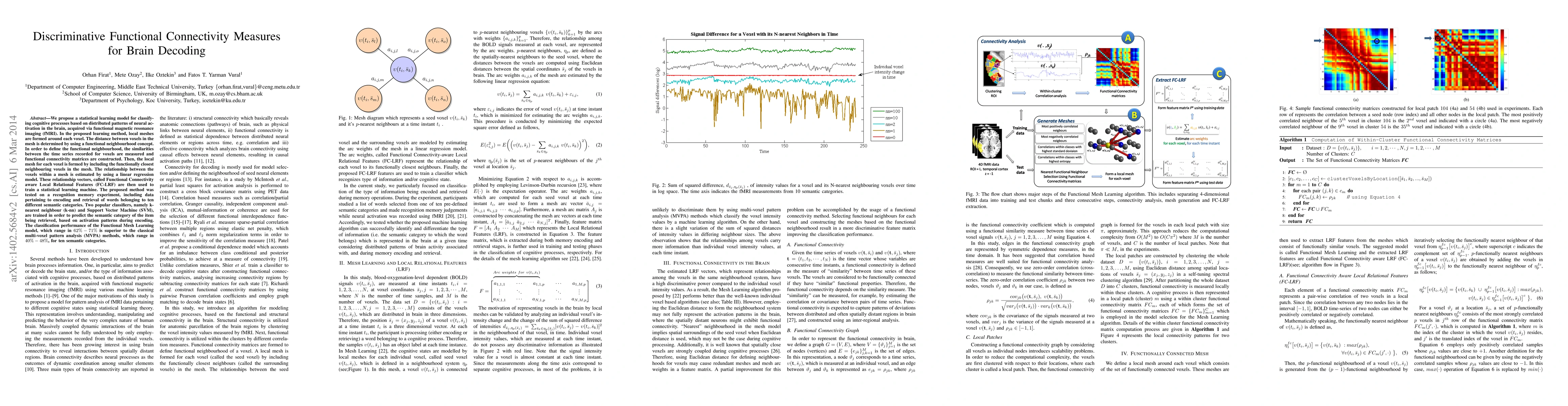 We propose a statistical learning model for classifying cognitive processes based on distributed patterns of neural activation in the brain, acquired via functional magnetic resonance imaging (fMRI). In the proposed learning method, local meshes are formed around each voxel. The distance between voxels in the mesh is determined by using a functional neighbourhood concept. In order to define the functional neighbourhood, the similarities between the time series recorded for voxels are measured and functional connectivity matrices are constructed. Then, the local mesh for each voxel is formed by including the functionally closest neighbouring voxels in the mesh. The relationship between the voxels within a mesh is estimated by using a linear regression model. These relationship vectors, called Functional Connectivity aware Local Relational Features (FC-LRF) are then used to train a statistical learning machine. The proposed method was tested on a recognition memory experiment, including data pertaining to encoding and retrieval of words belonging to ten different semantic categories. Two popular classifiers, namely k-nearest neighbour (k-nn) and Support Vector Machine (SVM), are trained in order to predict the semantic category of the item being retrieved, based on activation patterns during encoding. The classification performance of the Functional Mesh Learning model, which range in 62%-71% is superior to the classical multi-voxel pattern analysis (MVPA) methods, which range in 40%-48%, for ten semantic categories.