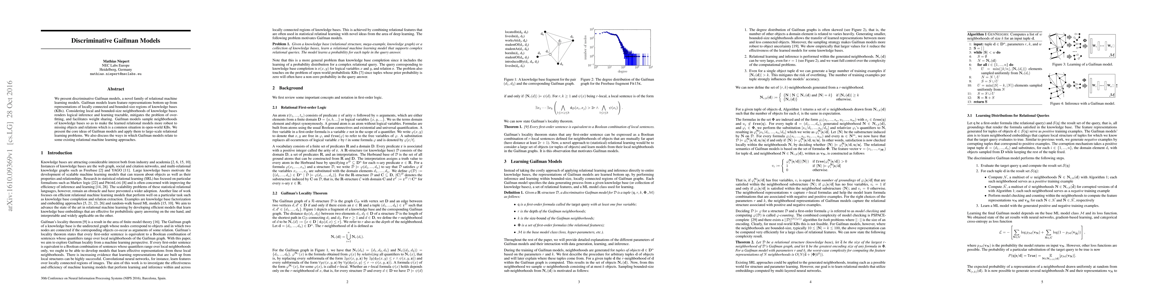 Discriminative Gaifman models introduce a novel approach for relational machine learning by learning feature representations from local, bounded-size regions of knowledge bases, enhancing tractability, mitigating overfitting, and improving robustness to missing data. The paper discusses the core ideas and applications of these models in large-scale relational learning.