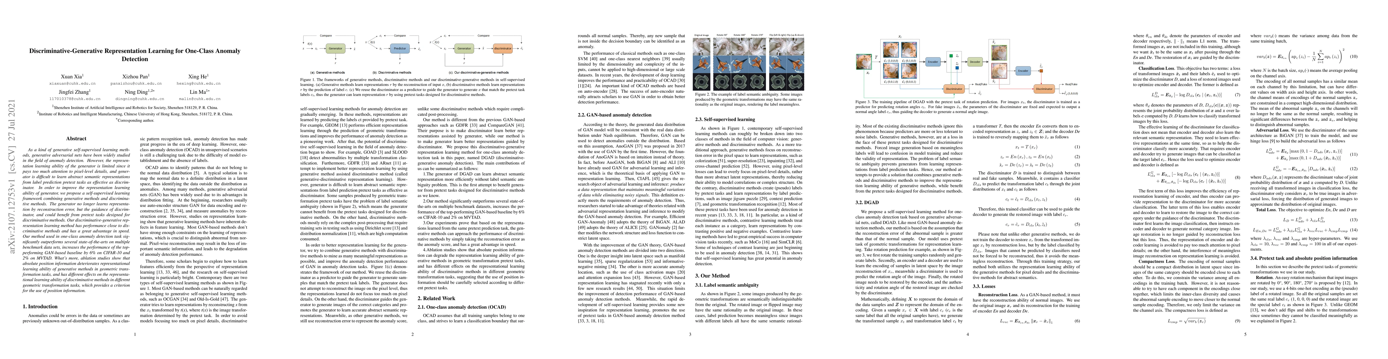 As a kind of generative self-supervised learning methods, generative adversarial nets have been widely studied in the field of anomaly detection. However, the representation learning ability of the generator is limited since it pays too much attention to pixel-level details, and generator is difficult to learn abstract semantic representations from label prediction pretext tasks as effective as discriminator. In order to improve the representation learning ability of generator, we propose a self-supervised learning framework combining generative methods and discriminative methods. The generator no longer learns representation by reconstruction error, but the guidance of discriminator, and could benefit from pretext tasks designed for discriminative methods. Our discriminative-generative representation learning method has performance close to discriminative methods and has a great advantage in speed. Our method used in one-class anomaly detection task significantly outperforms several state-of-the-arts on multiple benchmark data sets, increases the performance of the top-performing GAN-based baseline by 6% on CIFAR-10 and 2% on MVTAD.