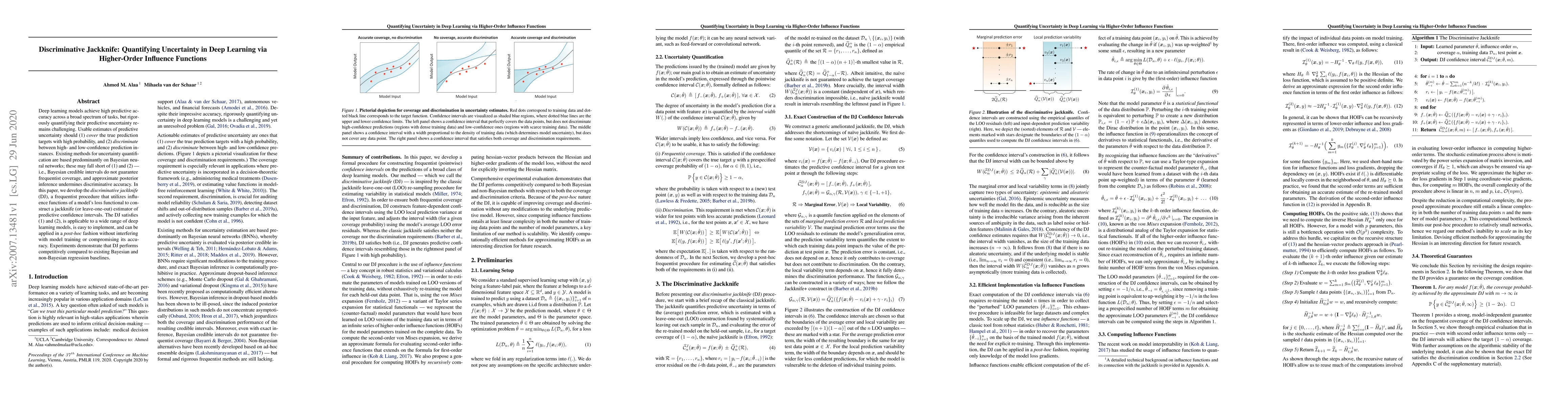 Deep learning models achieve high predictive accuracy across a broad spectrum of tasks, but rigorously quantifying their predictive uncertainty remains challenging. Usable estimates of predictive uncertainty should (1) cover the true prediction targets with high probability, and (2) discriminate between high- and low-confidence prediction instances. Existing methods for uncertainty quantification are based predominantly on Bayesian neural networks; these may fall short of (1) and (2) -- i.e., Bayesian credible intervals do not guarantee frequentist coverage, and approximate posterior inference undermines discriminative accuracy. In this paper, we develop the discriminative jackknife (DJ), a frequentist procedure that utilizes influence functions of a model's loss functional to construct a jackknife (or leave-one-out) estimator of predictive confidence intervals. The DJ satisfies (1) and (2), is applicable to a wide range of deep learning models, is easy to implement, and can be applied in a post-hoc fashion without interfering with model training or compromising its accuracy. Experiments demonstrate that DJ performs competitively compared to existing Bayesian and non-Bayesian regression baselines.