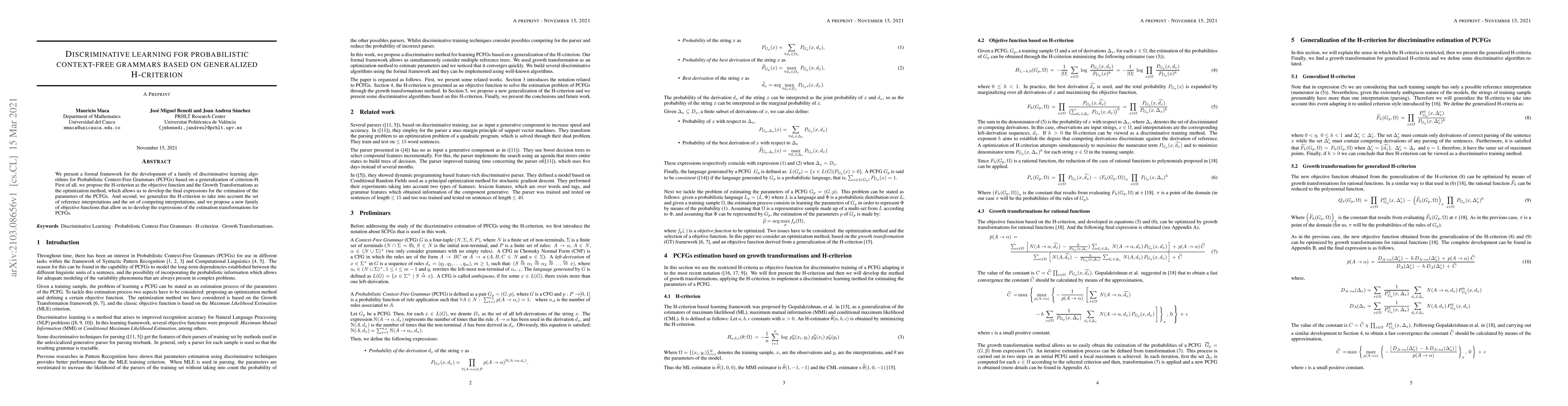 Researchers developed a new framework for discriminative learning in Probabilistic Context-Free Grammars (PCFGs) using the H-criterion and Growth Transformations. This approach enables more accurate estimation of PCFG parameters.