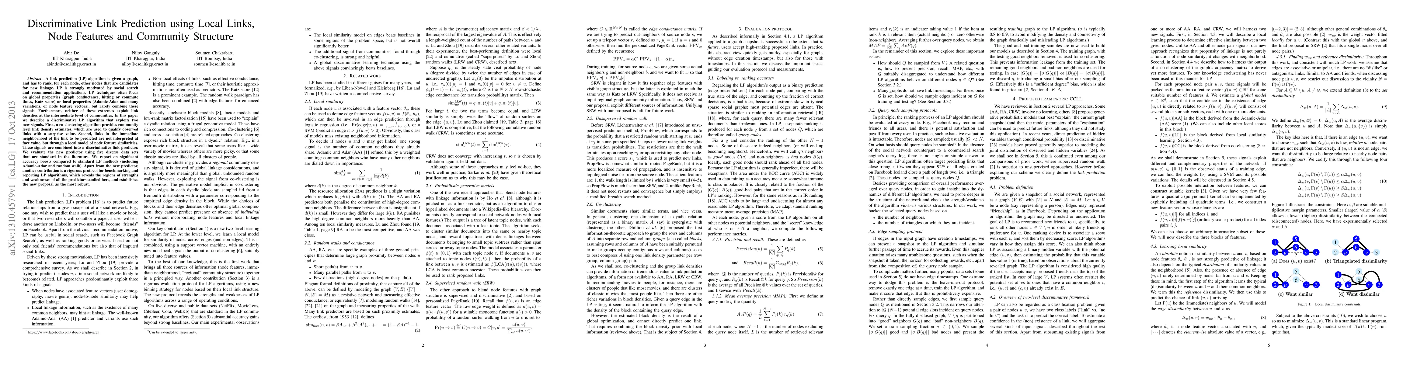 A link prediction (LP) algorithm is given a graph, and has to rank, for each node, other nodes that are candidates for new linkage. LP is strongly motivated by social search and recommendation applications. LP techniques often focus on global properties (graph conductance, hitting or commute times, Katz score) or local properties (Adamic-Adar and many variations, or node feature vectors), but rarely combine these signals. Furthermore, neither of these extremes exploit link densities at the intermediate level of communities. In this paper we describe a discriminative LP algorithm that exploits two new signals. First, a co-clustering algorithm provides community level link density estimates, which are used to qualify observed links with a surprise value. Second, links in the immediate neighborhood of the link to be predicted are not interpreted at face value, but through a local model of node feature similarities. These signals are combined into a discriminative link predictor. We evaluate the new predictor using five diverse data sets that are standard in the literature. We report on significant accuracy boosts compared to standard LP methods (including Adamic-Adar and random walk). Apart from the new predictor, another contribution is a rigorous protocol for benchmarking and reporting LP algorithms, which reveals the regions of strengths and weaknesses of all the predictors studied here, and establishes the new proposal as the most robust.