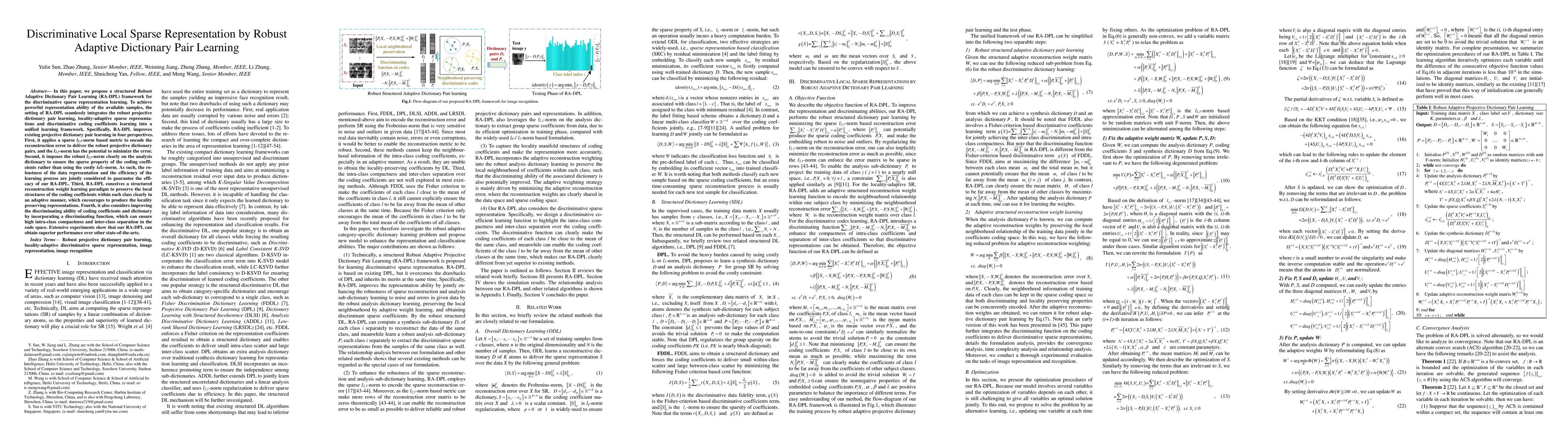 This paper introduces a Robust Adaptive Dictionary Pair Learning (RA-DPL) framework for discriminative sparse representation, integrating robust dictionary pair learning, locality-adaptive sparse representations, and discriminative coding coefficients. RA-DPL enhances existing methods by employing a robust l2,1-norm metric, adaptive reconstruction weights, and a discriminative function to achieve high intra-class compactness and inter-class separation, outperforming other state-of-the-art methods.