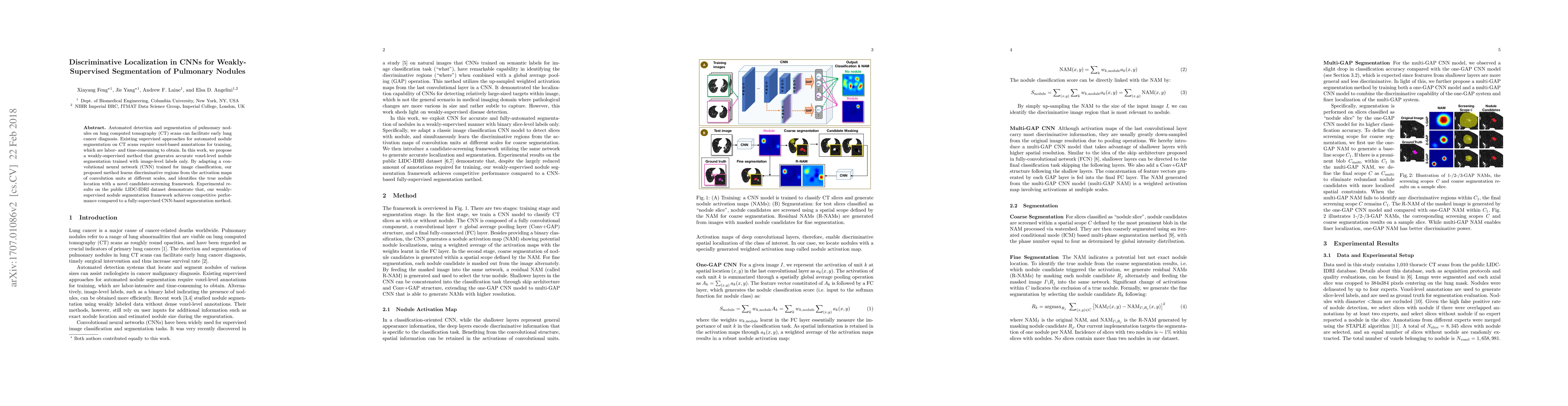 Automated detection and segmentation of pulmonary nodules on lung computed tomography (CT) scans can facilitate early lung cancer diagnosis. Existing supervised approaches for automated nodule segmentation on CT scans require voxel-based annotations for training, which are labor- and time-consuming to obtain. In this work, we propose a weakly-supervised method that generates accurate voxel-level nodule segmentation trained with image-level labels only. By adapting a convolutional neural network (CNN) trained for image classification, our proposed method learns discriminative regions from the activation maps of convolution units at different scales, and identifies the true nodule location with a novel candidate-screening framework. Experimental results on the public LIDC-IDRI dataset demonstrate that, our weakly-supervised nodule segmentation framework achieves competitive performance compared to a fully-supervised CNN-based segmentation method.