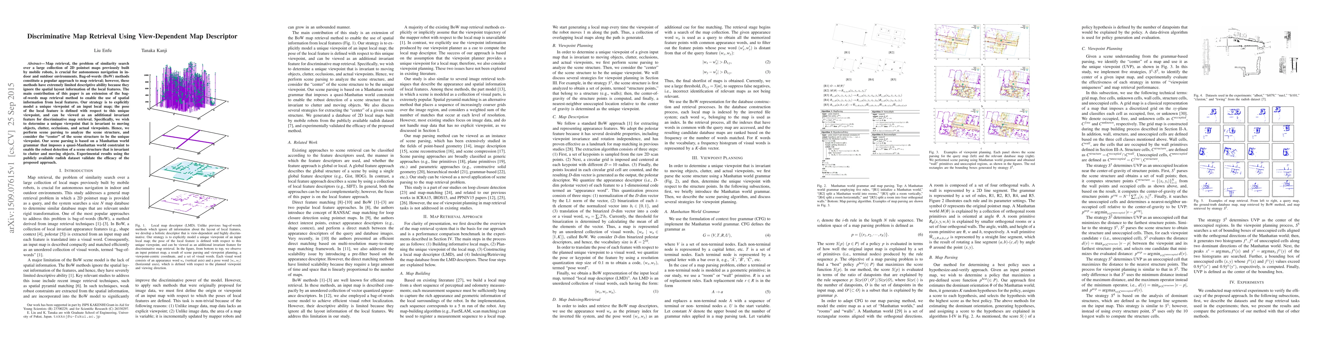 This paper proposes an enhanced map retrieval method that incorporates spatial layout information from local features, addressing the limitations of traditional bag-of-words approaches. It introduces a unique viewpoint-based descriptor to model spatial relationships, validated through scene parsing and experiments on the radish dataset.