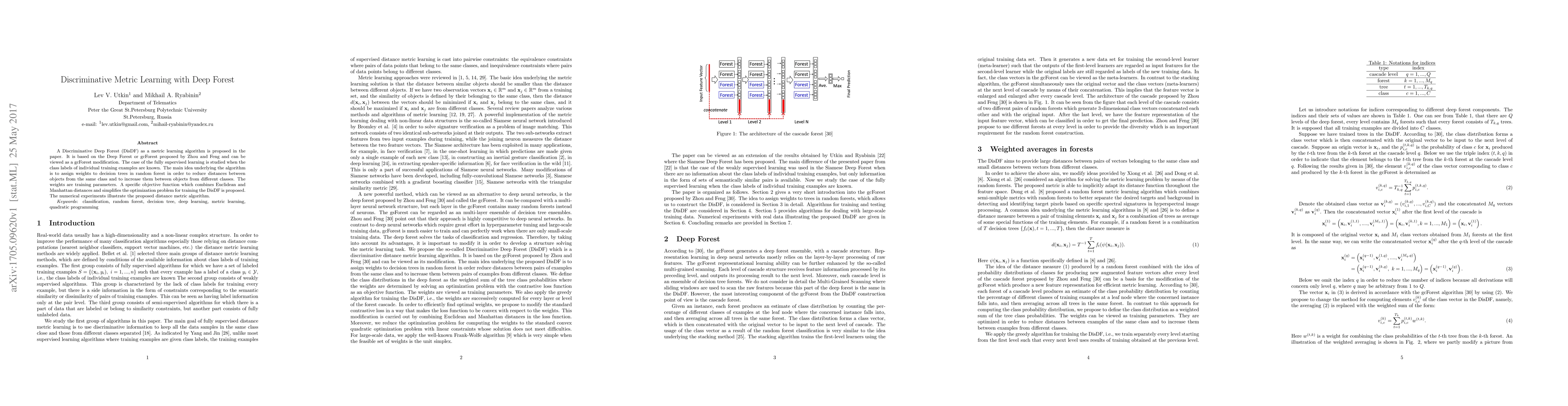 A new metric learning algorithm called Discriminative Deep Forest (DisDF) is proposed to improve object classification accuracy by assigning weights to decision trees in random forests. The DisDF algorithm reduces distances between objects from the same class and increases them between objects from different classes.