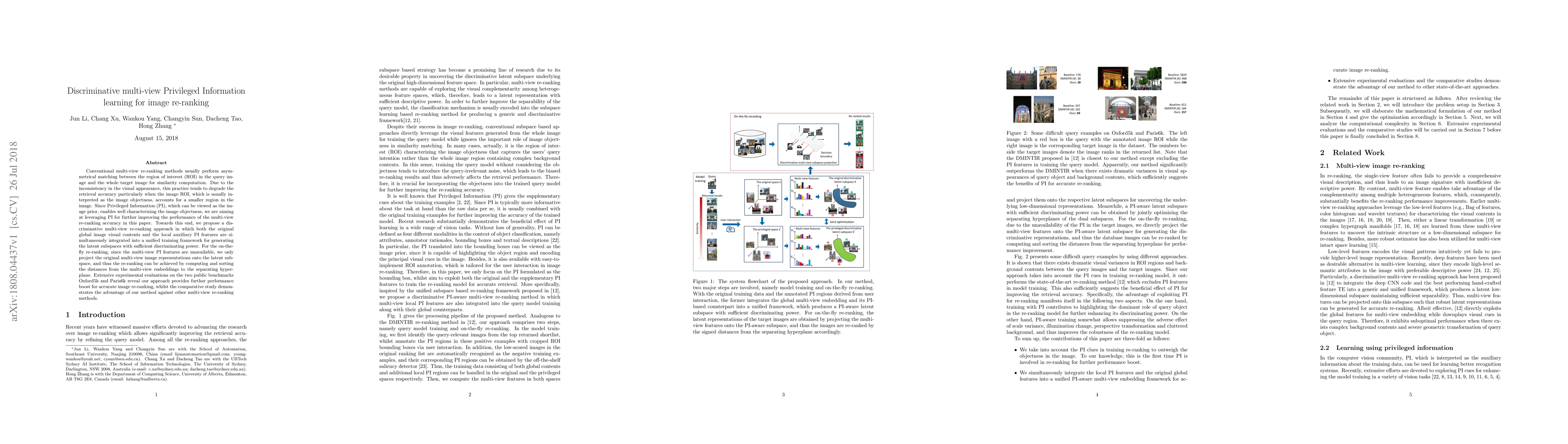 This paper proposes a discriminative multi-view re-ranking method that integrates both global image features and local privileged information (PI) to enhance image retrieval accuracy. The approach projects multi-view image representations onto a latent subspace for on-the-fly re-ranking, achieving superior performance over existing methods on Oxford5k and Paris6k benchmarks.