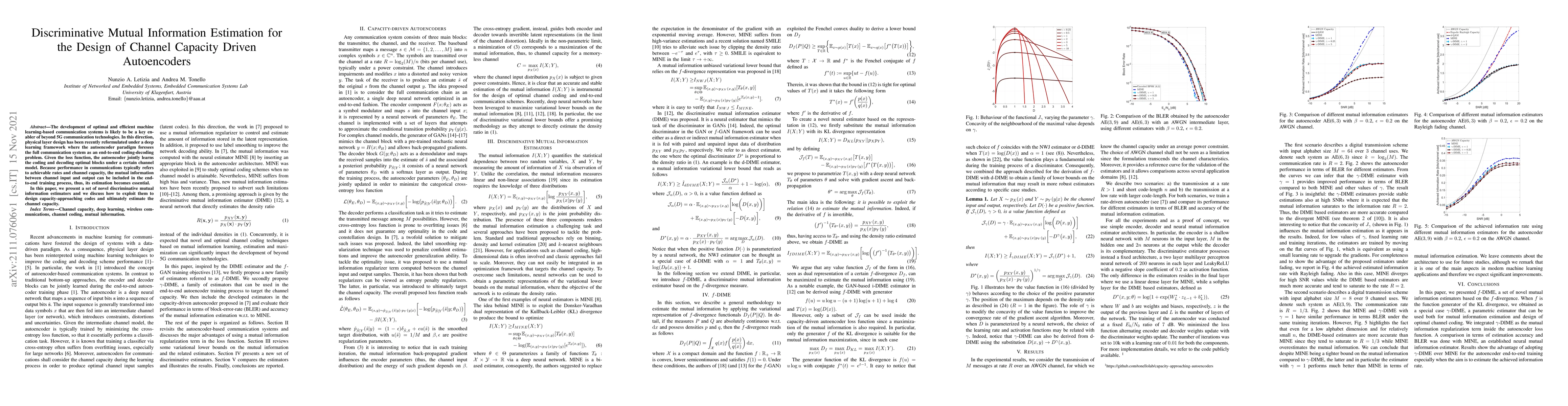 This paper introduces novel discriminative mutual information estimators for designing autoencoders in communication systems. These estimators aim to optimize the coding and decoding processes to approach the channel capacity, thereby enabling efficient beyond 5G communication technologies.