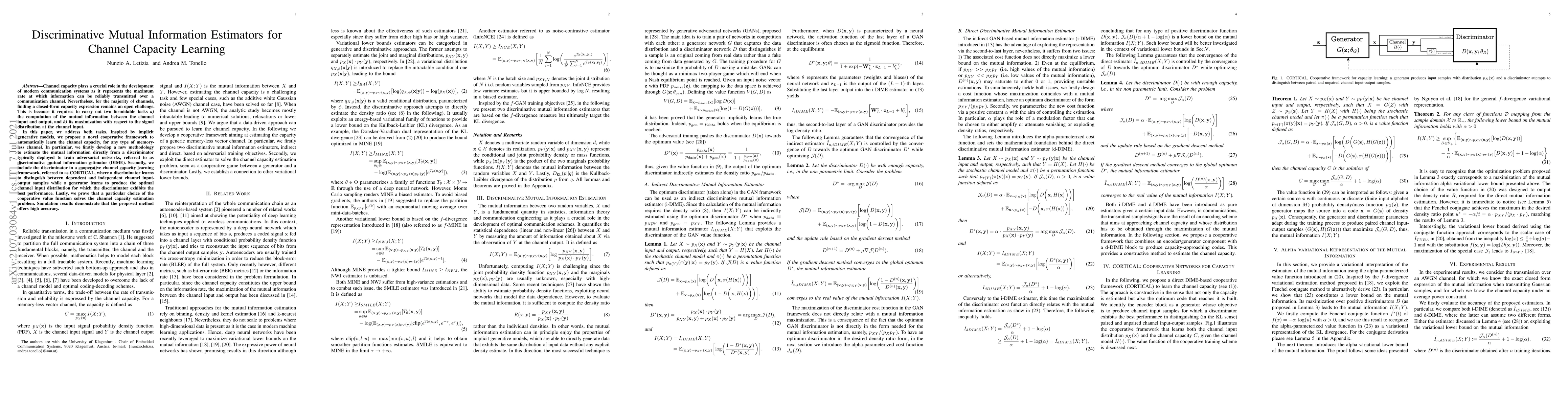 This paper proposes a novel framework, CORTICAL, to learn channel capacity using discriminative mutual information estimators (DIME) derived from discriminators in adversarial networks. The method estimates mutual information and optimizes the channel input distribution to maximize capacity, demonstrating high accuracy in simulations.