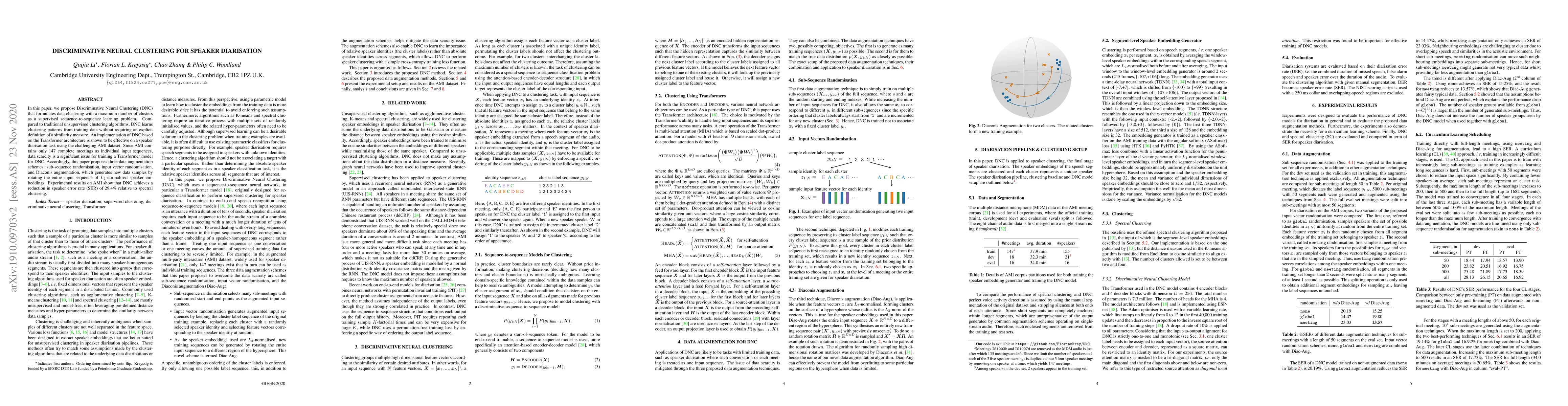 This paper introduces Discriminative Neural Clustering (DNC) for speaker diarisation, employing a supervised sequence-to-sequence learning approach to cluster data without predefined similarity measures. To address data scarcity in the AMI dataset, the authors propose three data augmentation techniques, resulting in a 29.4% relative reduction in the speaker error rate compared to spectral clustering.