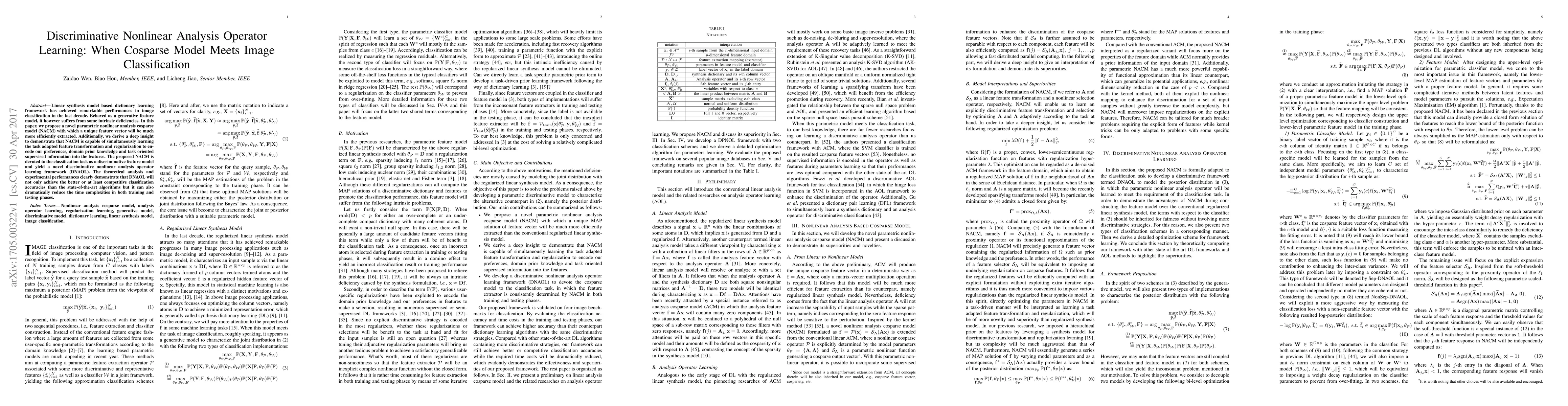 This paper introduces a novel discriminative nonlinear analysis cosparse model (NACM) for image classification, which extracts more efficient features compared to linear synthesis models. The proposed framework, DNAOL, integrates task-adapted feature transformation and regularization, achieving better or competitive classification accuracies with reduced time complexities during training and testing.