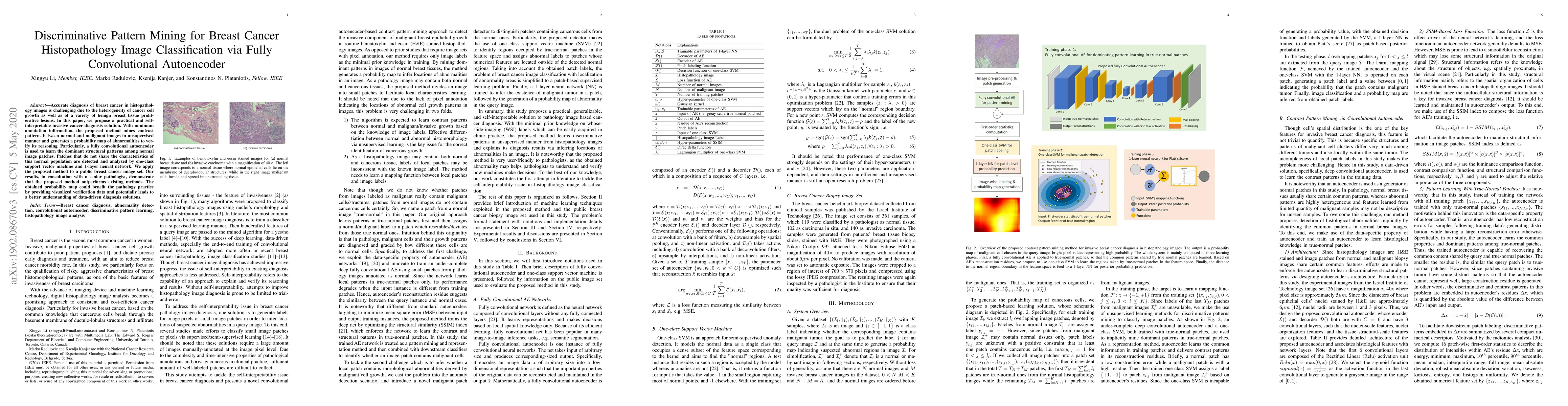 The paper proposes a discriminative pattern mining approach for invasive carcinoma diagnosis in routine H&E stained breast tissue histopathology images using a fully convolutional autoencoder and one-class SVM.