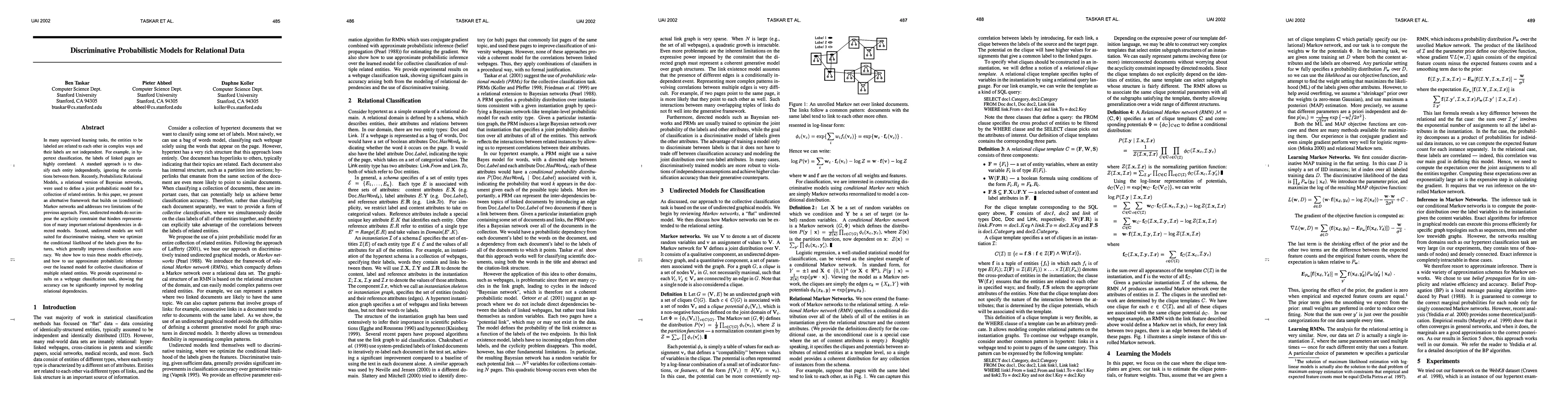 This paper proposes a discriminative probabilistic framework using Markov networks for relational data, addressing limitations of previous Probabilistic Relational Models. It demonstrates improved classification accuracy through discriminative training and collective classification of related entities, validated by experiments on webpage classification.