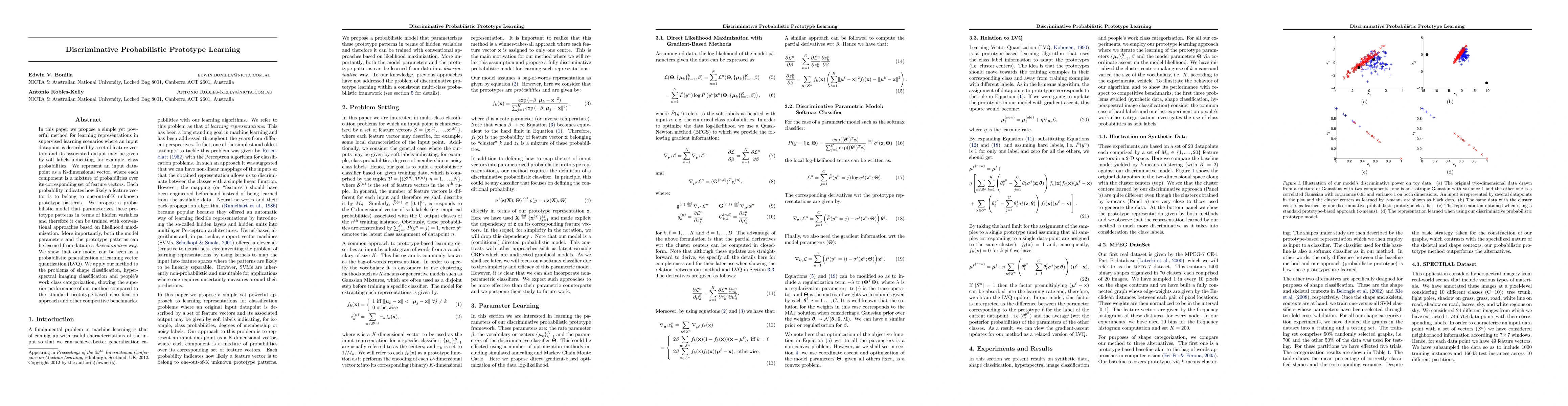 This paper introduces a discriminative probabilistic prototype learning method for supervised learning, representing data as mixtures of probabilities over feature vectors linked to prototype patterns. The model, trained via likelihood maximization, generalizes learning vector quantization and outperforms standard approaches in tasks like shape classification and hyperspectral imaging.