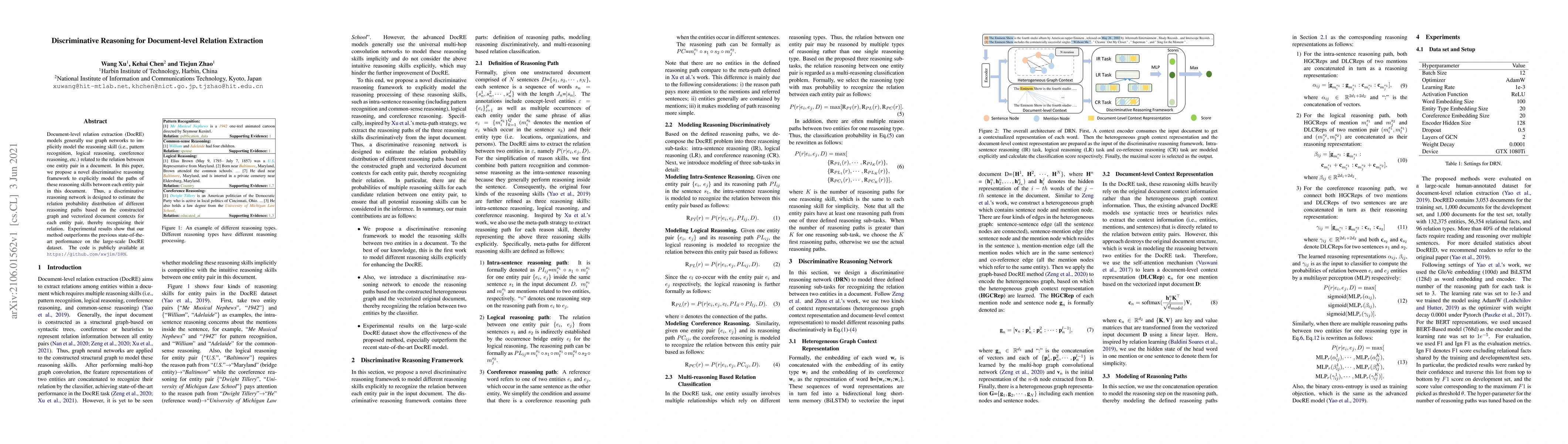 This paper introduces a discriminative reasoning framework for document-level relation extraction, explicitly modeling reasoning paths between entity pairs. The proposed network outperforms existing methods on large-scale datasets.