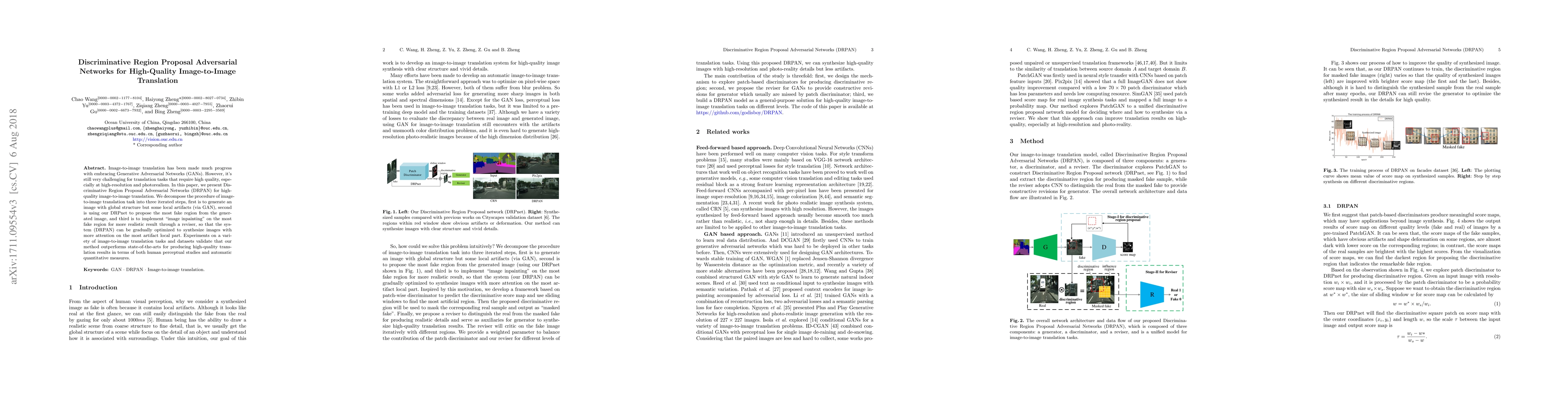 This paper introduces Discriminative Region Proposal Adversarial Networks (DRPAN) for high-quality image-to-image translation, which iteratively refines generated images by identifying and improving the most artifact-prone regions, outperforming state-of-the-art methods in both perceptual and quantitative evaluations.