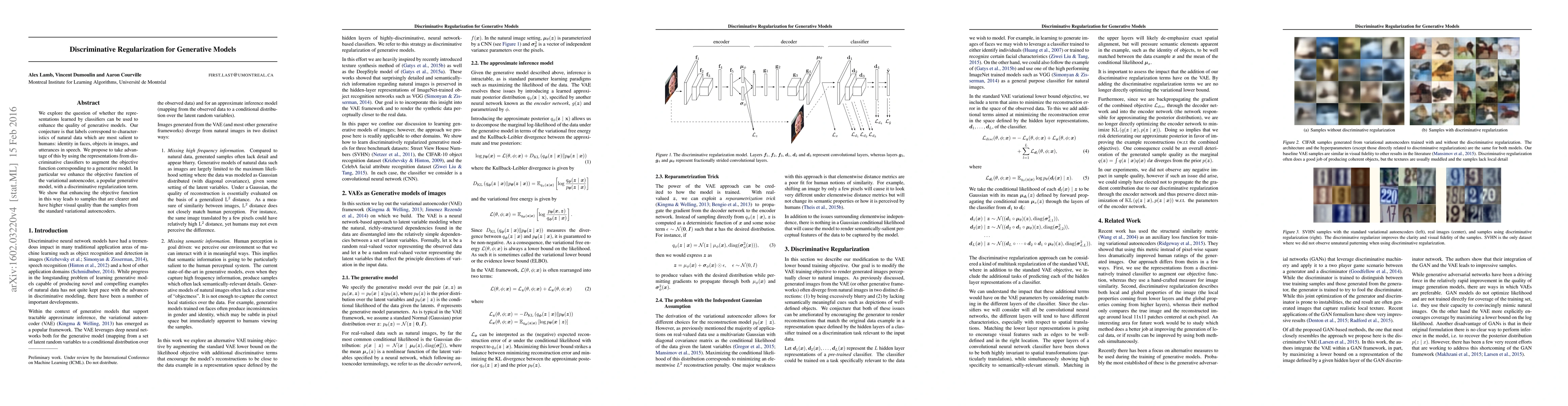This paper investigates using discriminative classifier representations to improve generative models, specifically enhancing a variational autoencoder with a discriminative regularization term. The results show that this approach generates clearer and higher quality samples compared to standard variational autoencoders.