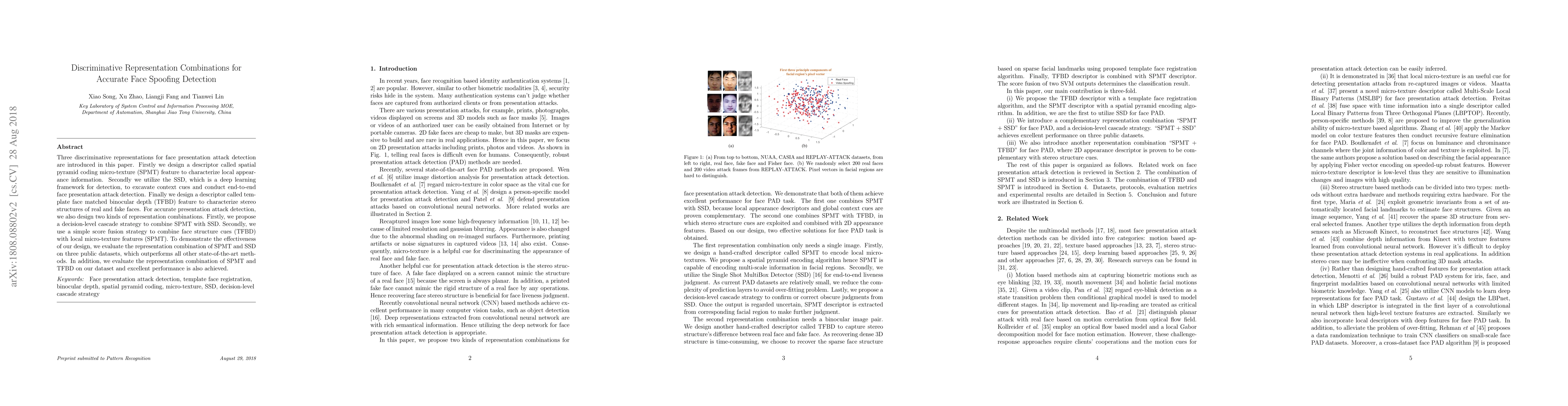 This paper introduces three discriminative representations for face spoofing detection, including SPMT, SSD, and TFBD features, and proposes two representation combination strategies to enhance detection accuracy. Evaluations on multiple datasets show superior performance compared to state-of-the-art methods.