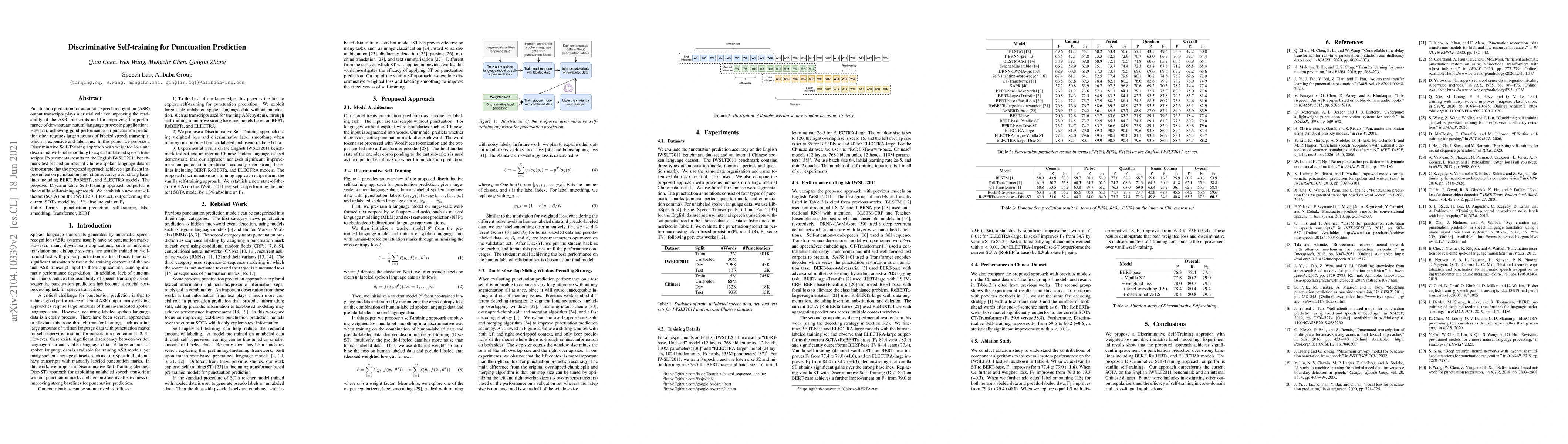 This paper proposes a Discriminative Self-Training method for improving punctuation prediction in automatic speech recognition transcripts, leveraging unlabeled data to achieve better performance. The approach outperforms existing models like BERT and RoBERTa, establishing a new state-of-the-art on the IWSLT2011 test set.