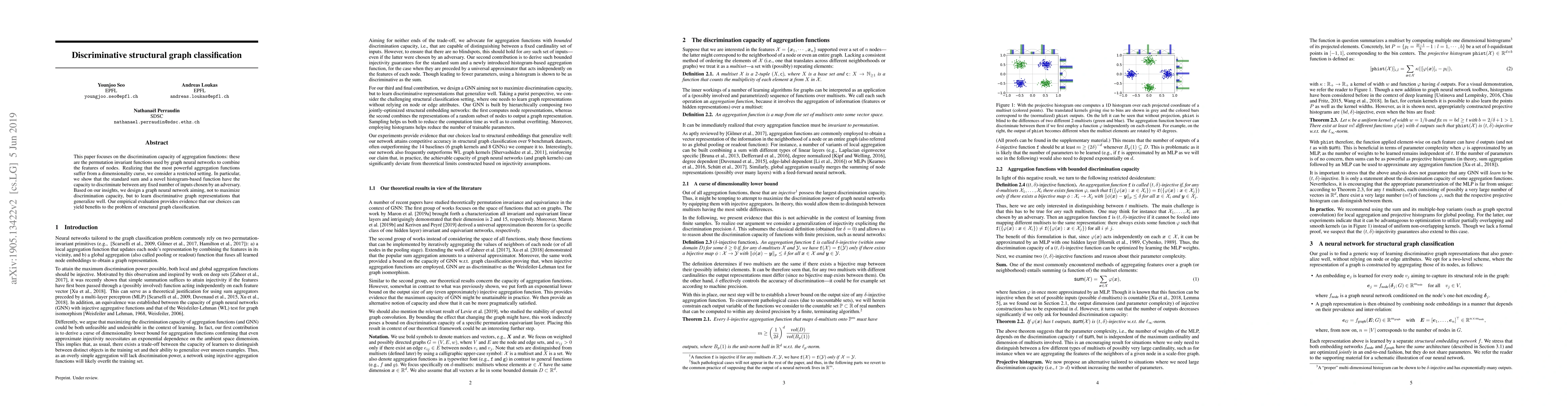 This paper focuses on the discrimination capacity of aggregation functions: these are the permutation invariant functions used by graph neural networks to combine the features of nodes. Realizing that the most powerful aggregation functions suffer from a dimensionality curse, we consider a restricted setting. In particular, we show that the standard sum and a novel histogram-based function have the capacity to discriminate between any fixed number of inputs chosen by an adversary. Based on our insights, we design a graph neural network aiming, not to maximize discrimination capacity, but to learn discriminative graph representations that generalize well. Our empirical evaluation provides evidence that our choices can yield benefits to the problem of structural graph classification.