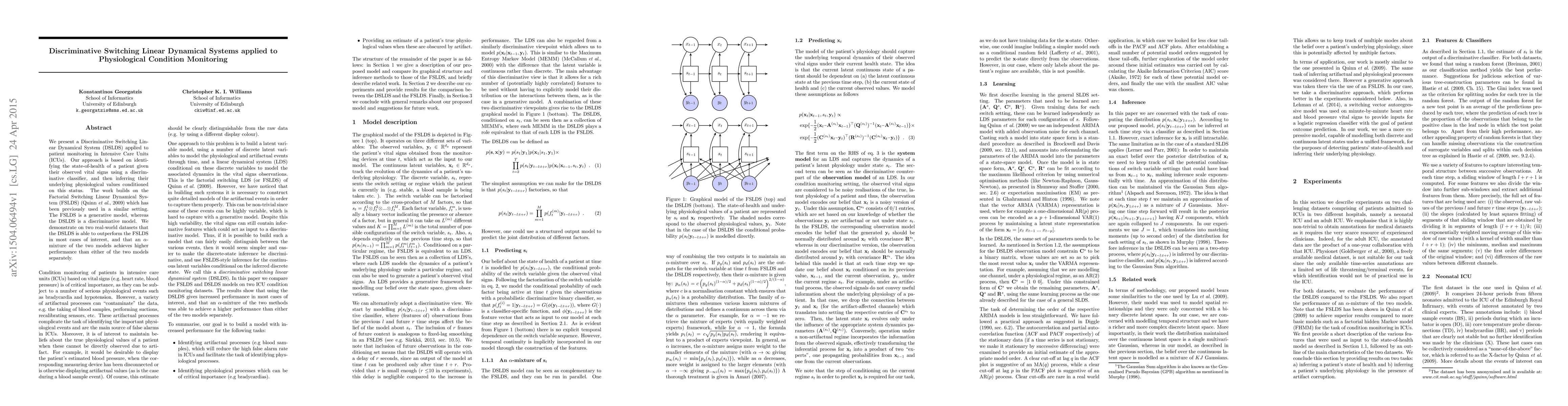 A new model called Discriminative Switching Linear Dynamical Systems (DSLDS) is proposed for monitoring patient health in ICUs, outperforming a similar previous model in most cases, and an $eta$-mixture of the two models achieves higher performance.