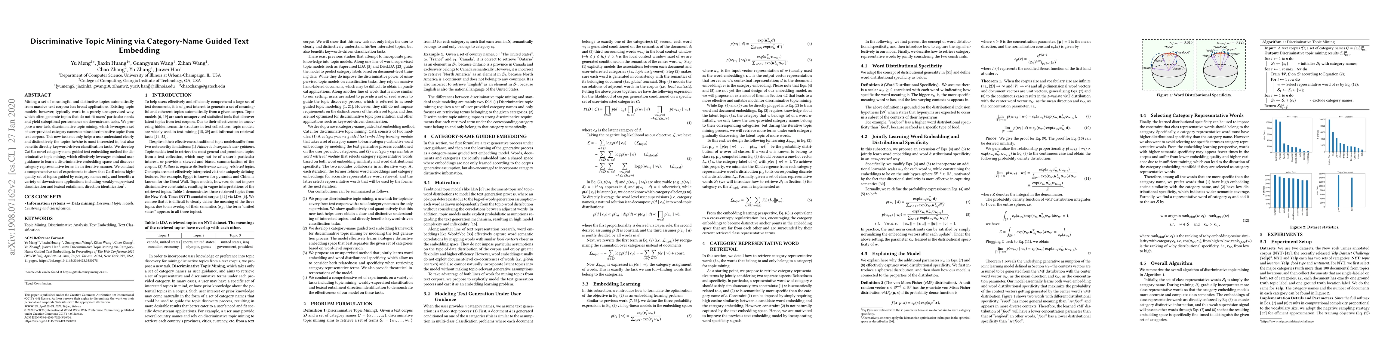 A new approach called CatE mines meaningful topics from text corpora using user-provided category names, achieving high-quality results in various applications like classification and lexical entailment.