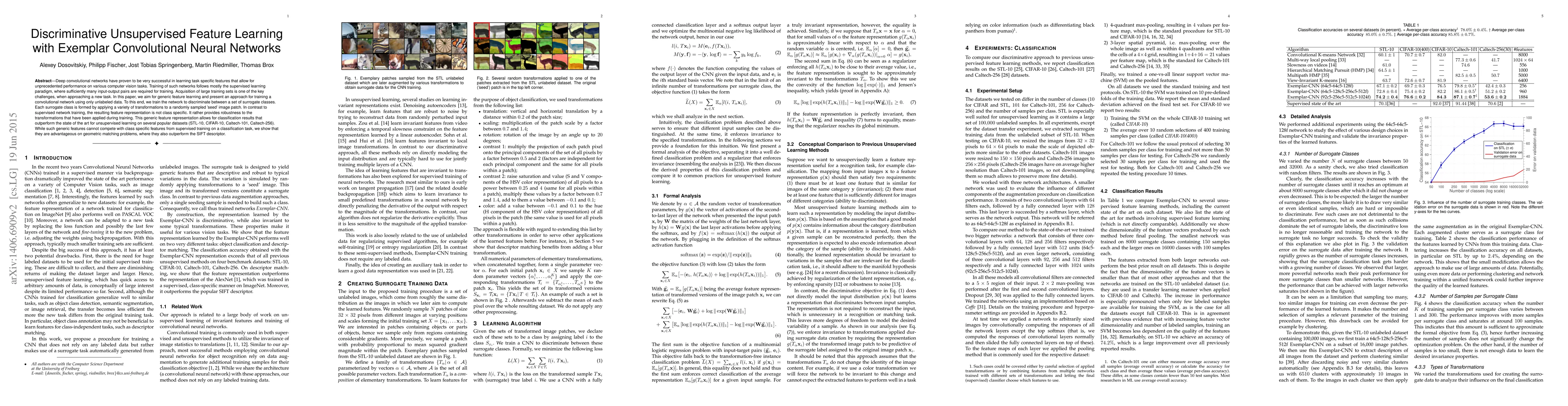 This paper proposes a method for unsupervised feature learning using convolutional neural networks that can outperform supervised methods on certain tasks. The approach uses only unlabeled data to learn generic features that provide robustness to transformations, achieving state-of-the-art results on several datasets.