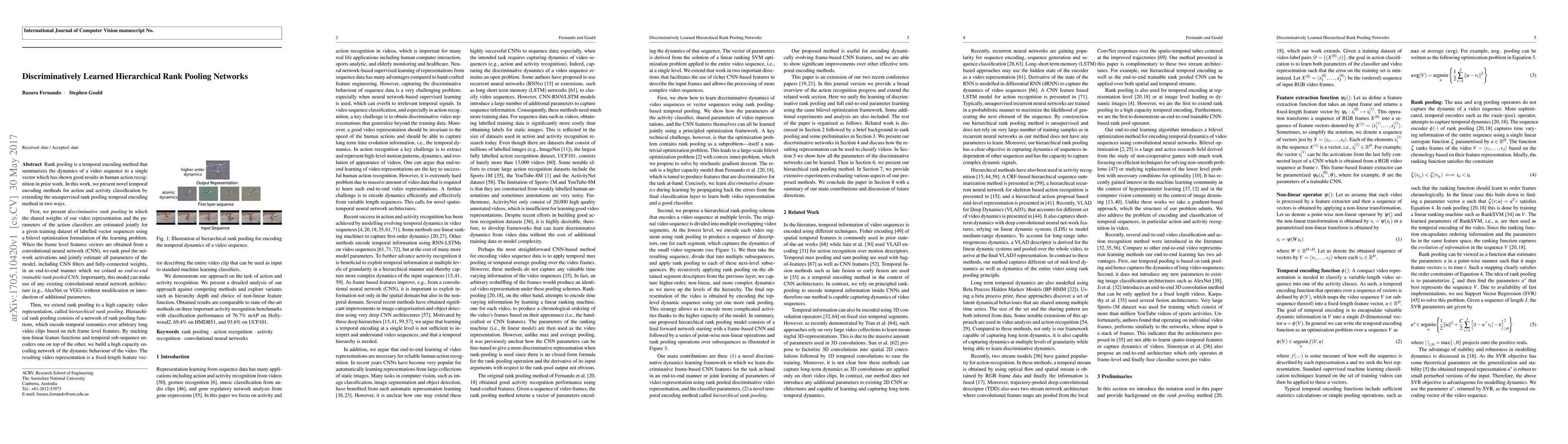 This paper introduces discriminative rank pooling and hierarchical rank pooling networks for action and activity classification, achieving state-of-the-art results on three benchmarks. The approach jointly optimizes CNN filters and classifier weights, and constructs a high-capacity video representation using stacked rank pooling functions.