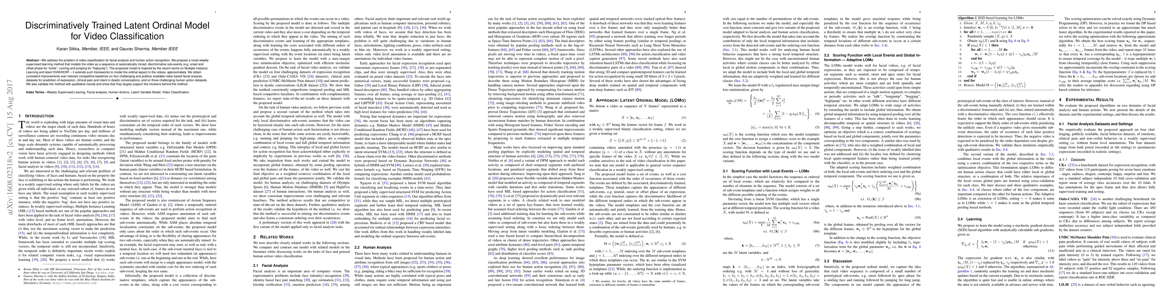 This paper introduces a discriminatively trained latent ordinal model for video classification, leveraging weakly supervised learning to model videos as sequences of discriminative sub-events. The model shows consistent performance improvements over baselines on facial analysis and human action recognition tasks.