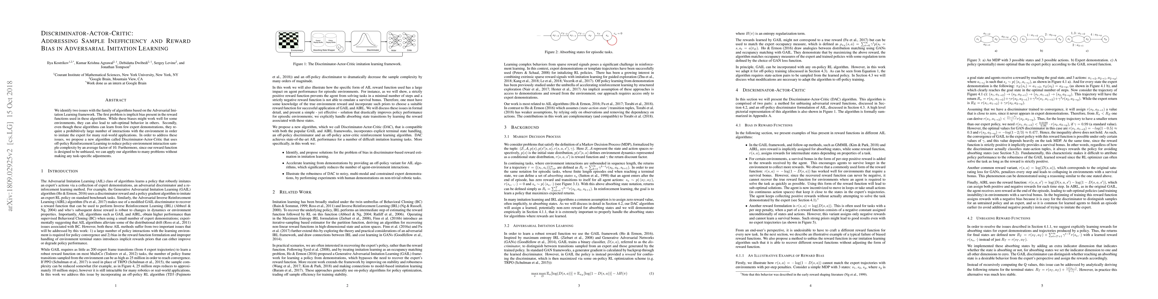 The paper addresses implicit reward biases and sample inefficiency in Adversarial Imitation Learning algorithms. It proposes a new Discriminator-Actor-Critic algorithm that leverages off-policy Reinforcement Learning to significantly reduce sample complexity and employs an unbiased reward function for broader applicability.