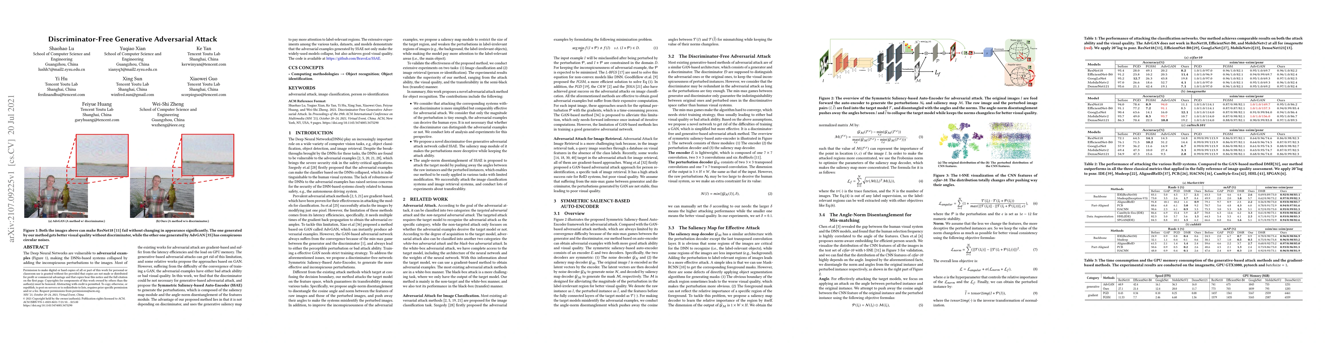 The Deep Neural Networks are vulnerable toadversarial exam-ples(Figure 1), making the DNNs-based systems collapsed byadding the inconspicuous perturbations to the images. Most of the existing works for adversarial attack are gradient-based and suf-fer from the latency efficiencies and the load on GPU memory. Thegenerative-based adversarial attacks can get rid of this limitation,and some relative works propose the approaches based on GAN.However, suffering from the difficulty of the convergence of train-ing a GAN, the adversarial examples have either bad attack abilityor bad visual quality. In this work, we find that the discriminatorcould be not necessary for generative-based adversarial attack, andpropose theSymmetric Saliency-based Auto-Encoder (SSAE)to generate the perturbations, which is composed of the saliencymap module and the angle-norm disentanglement of the featuresmodule. The advantage of our proposed method lies in that it is notdepending on discriminator, and uses the generative saliency map to pay more attention to label-relevant regions. The extensive exper-iments among the various tasks, datasets, and models demonstratethat the adversarial examples generated by SSAE not only make thewidely-used models collapse, but also achieves good visual quality.The code is available at https://github.com/BravoLu/SSAE.