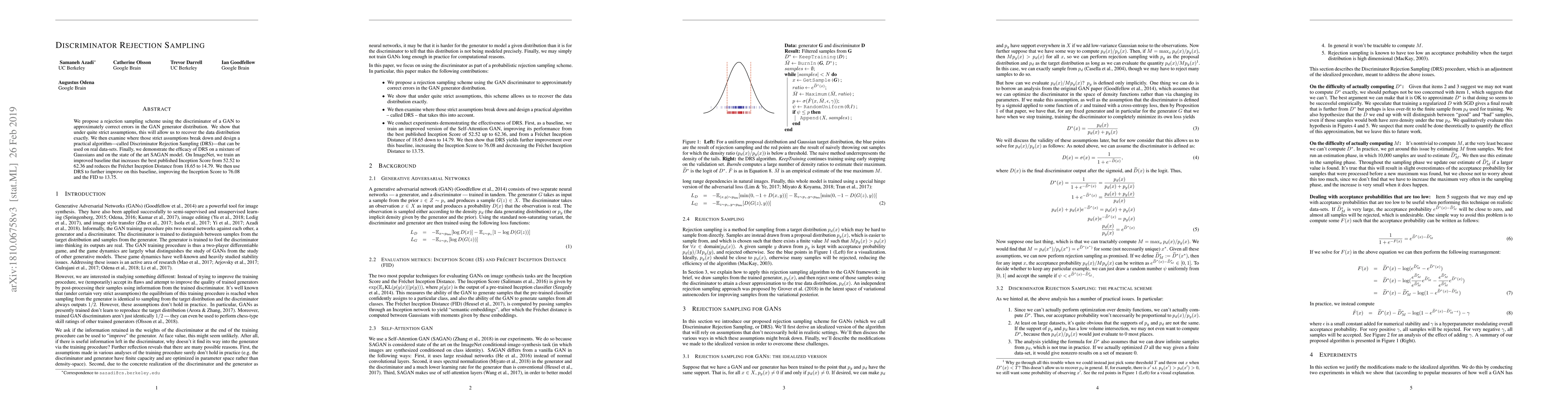 We propose a rejection sampling scheme using the discriminator of a GAN to approximately correct errors in the GAN generator distribution. We show that under quite strict assumptions, this will allow us to recover the data distribution exactly. We then examine where those strict assumptions break down and design a practical algorithm - called Discriminator Rejection Sampling (DRS) - that can be used on real data-sets. Finally, we demonstrate the efficacy of DRS on a mixture of Gaussians and on the SAGAN model, state-of-the-art in the image generation task at the time of developing this work. On ImageNet, we train an improved baseline that increases the Inception Score from 52.52 to 62.36 and reduces the Frechet Inception Distance from 18.65 to 14.79. We then use DRS to further improve on this baseline, improving the Inception Score to 76.08 and the FID to 13.75.