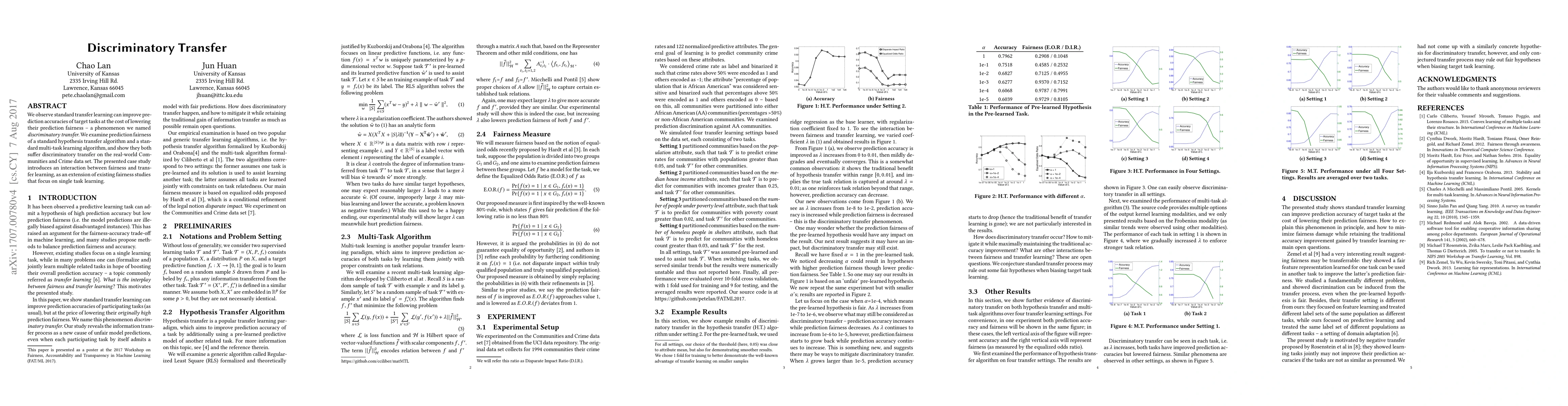 The paper identifies 'discriminatory transfer', a situation where transfer learning enhances prediction accuracy but decreases fairness in target tasks. Analyzing real-world Communities and Crime data, it shows standard transfer and multi-task learning algorithms suffer from this issue, marking an important intersection between fairness and transfer learning studies.