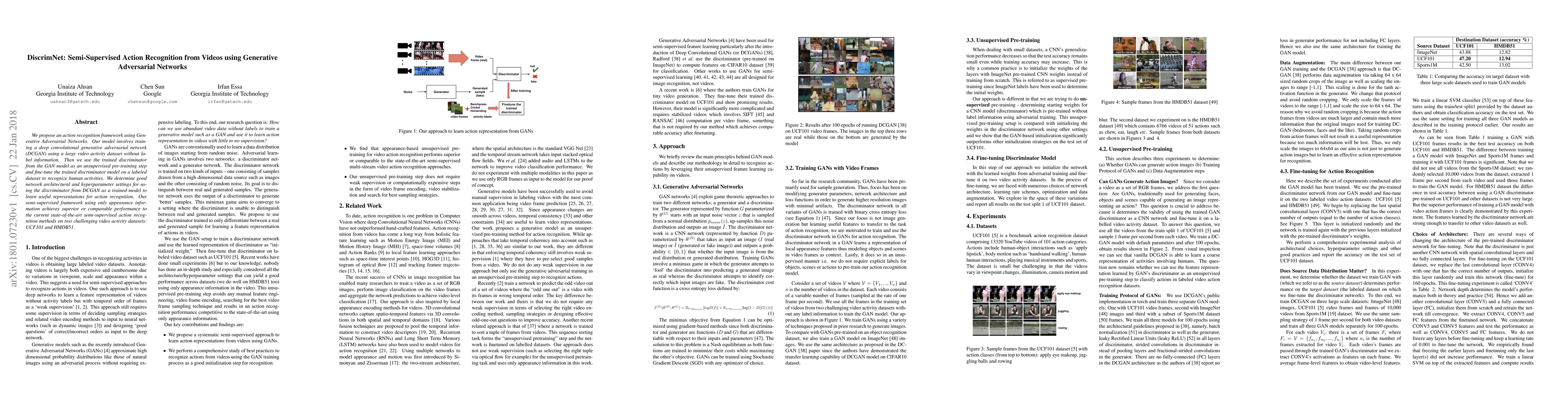 This paper introduces DiscrimNet, a semi-supervised action recognition framework leveraging Generative Adversarial Networks (GANs). It trains a deep convolutional GAN on unlabeled video data and fine-tunes the discriminator on labeled data to achieve superior performance on UCF101 and HMDB51 datasets.