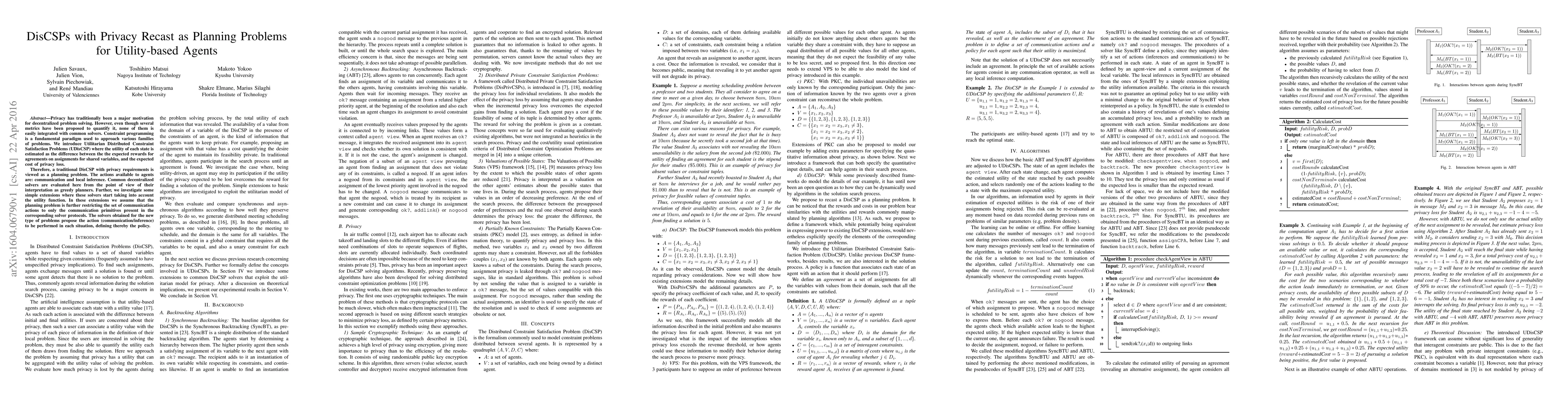 This paper recasts privacy-aware decentralized problem solving as planning problems for utility-based agents, introducing UDisCSPs where utility is the difference between reward and privacy cost. It evaluates decentralized solvers as greedy planners and explores extensions that incorporate utility functions, proposing policies for communication and inference.