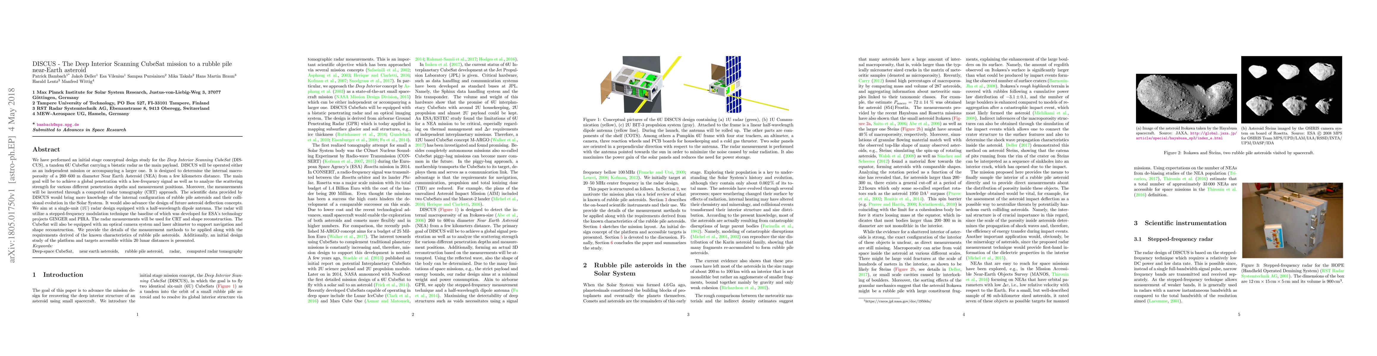 We have performed an initial stage conceptual design study for the Deep Interior Scanning CubeSat (DISCUS), a tandem 6U CubeSat carrying a bistatic radar as main payload. DISCUS will be operated either as an independent mission or accompanying a larger one. It is designed to determine the internal macroporosity of a 260-600 m diameter Near Earth Asteroid (NEA) from a few kilometers distance. The main goal will be to achieve a global penetration with a low-frequency signal as well as to analyze the scattering strength for various different penetration depths and measurement positions. Moreover, the measurements will be inverted through a computed radar tomography (CRT) approach. The scientific data provided by DISCUS would bring more knowledge of the internal configuration of rubble pile asteroids and their collisional evolution in the Solar System. It would also advance the design of future asteroid deflection concepts. We aim at a single-unit (1U) radar design equipped with a half-wavelength dipole antenna. The radar will utilize a stepped-frequency modulation technique the baseline of which was developed for ESA's technology projects GINGER and PIRA. The radar measurements will be used for CRT and shape reconstruction. The CubeSat will also be equipped with an optical camera system and laser altimeter to sup- port navigation and shape reconstruction. We provide the details of the measurement methods to be applied along with the requirements derived of the known characteristics of rubble pile asteroids.