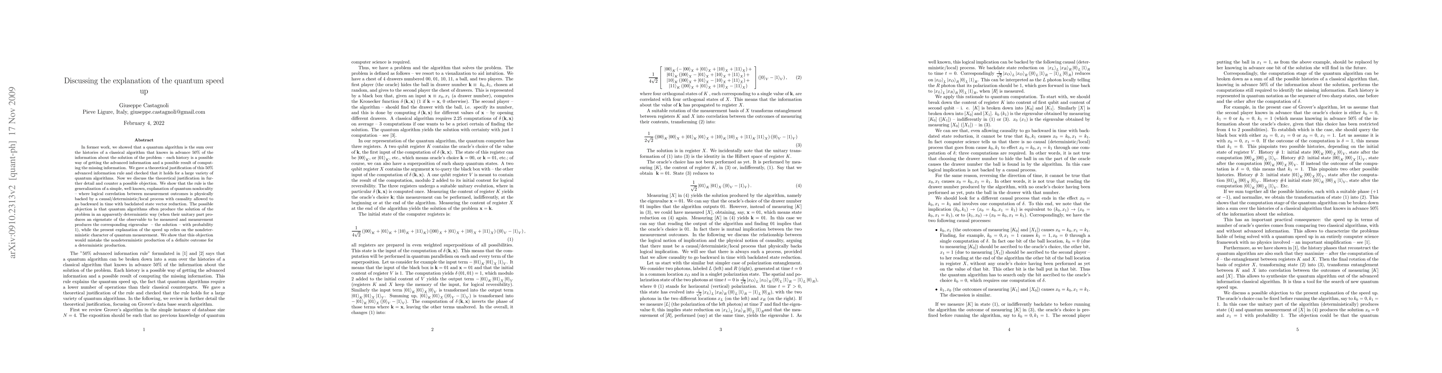 In former work, we showed that a quantum algorithm is the sum over the histories of a classical algorithm that knows in advance 50% of the information about the solution of the problem - each history is a possible way of getting the advanced information and a possible result of computing the missing information. We gave a theoretical justification of this 50% advanced information rule and checked that it holds for a large variety of quantum algorithms. Now we discuss the theoretical justification in further detail and counter a possible objection. We show that the rule is the generalization of a simple, well known, explanation of quantum nonlocality - where logical correlation between measurement outcomes is physically backed by a causal/deterministic/local process with causality allowed to go backward in time with backdated state vector reduction. The possible objection is that quantum algorithms often produce the solution of the problem in an apparently deterministic way (when their unitary part produces an eigenstate of the observable to be measured and measurement produces the corresponding eigenvalue - the solution - with probability 1), while the present explanation of the speed up relies on the nondeterministic character of quantum measurement. We show that this objection would mistake the nondeterministic production of a definite outcome for a deterministic production.