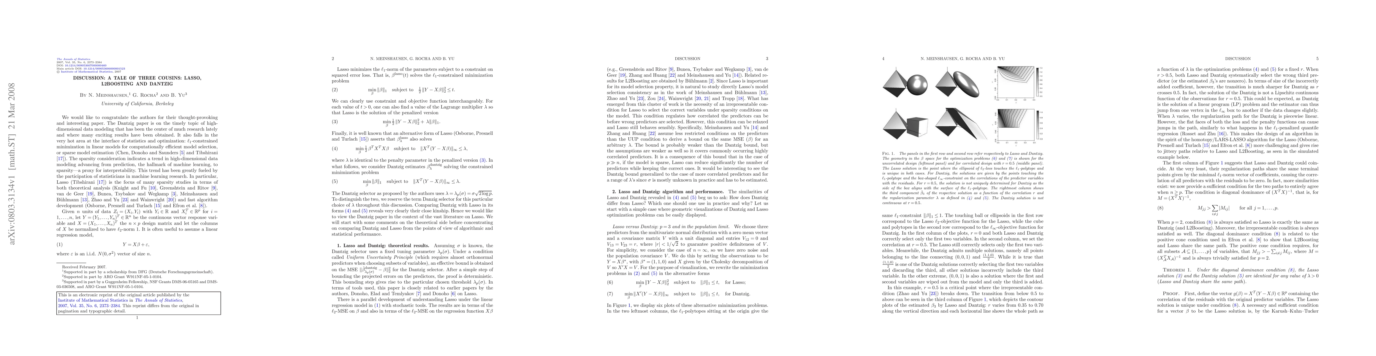 Summary: This paper discusses the Dantzig selector, a statistical method for estimation when the number of variables $p$ exceeds the number of observations $n$, and compares it with Lasso and L2Boosting, highlighting their differences and applications. The Dantzig selector is shown to provide optimal statistical guarantees under certain conditions.