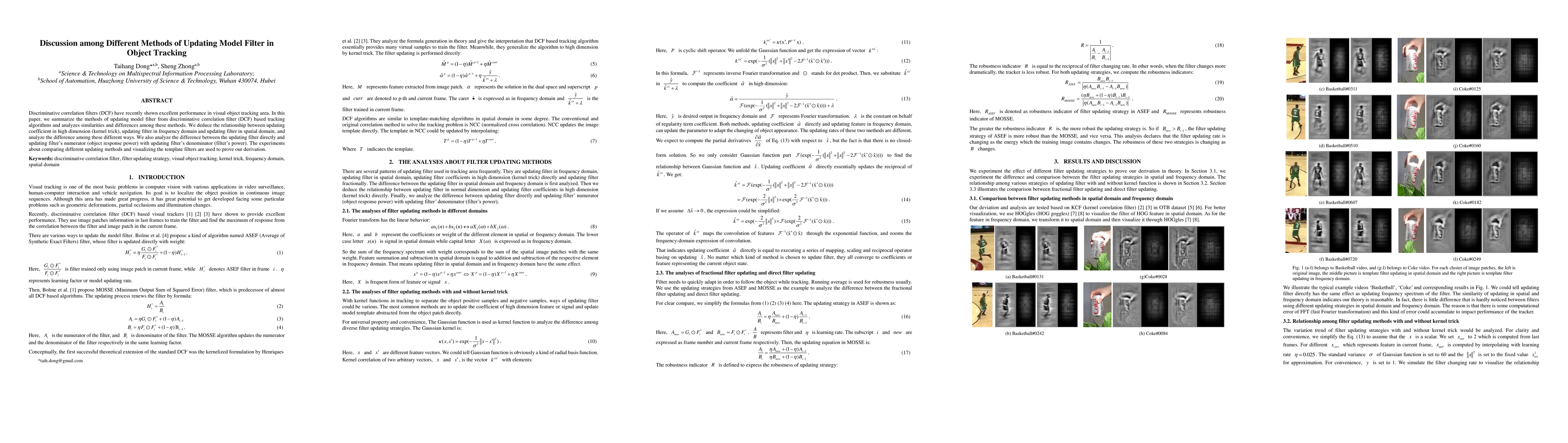 This paper discusses and compares methods of updating model filters in discriminative correlation filter-based visual object tracking algorithms. It establishes relationships between different updating techniques in high-dimension, frequency domain, and spatial domain. Experiments validate these derivations, aiming to improve understanding and efficiency in object tracking.