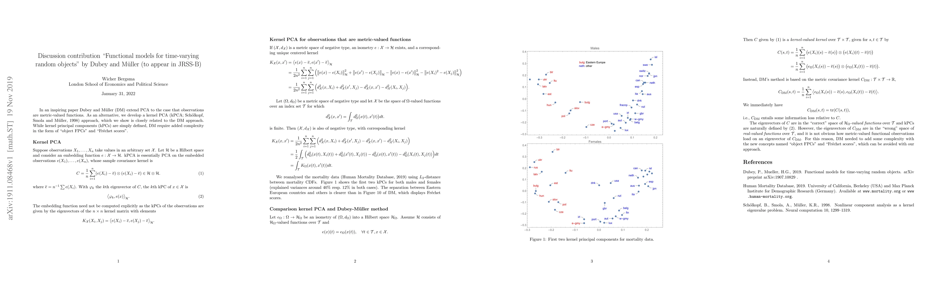 In an inspiring paper Dubey and M\"uller (DM) extend PCA to the case that observations are metric-valued functions. As an alternative, we develop a kernel PCA approach, which we show is closely related to the DM approach. While kernel principal components (kPCs) are simply defined, DM require added complexity in the form of "object FPCs'' and "Fr\'echet scores".