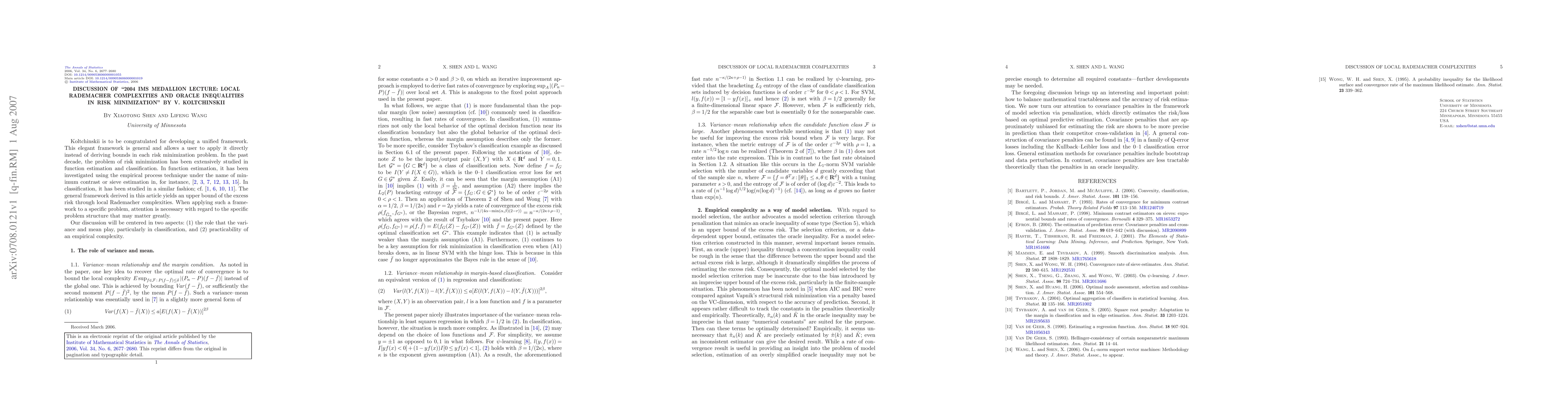 Discussion of ``2004 IMS Medallion Lecture: Local Rademacher complexities and oracle inequalities in risk minimization'' by V. Koltchinskii [arXiv:0708.0083]